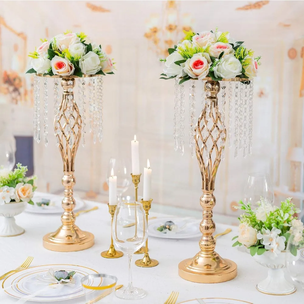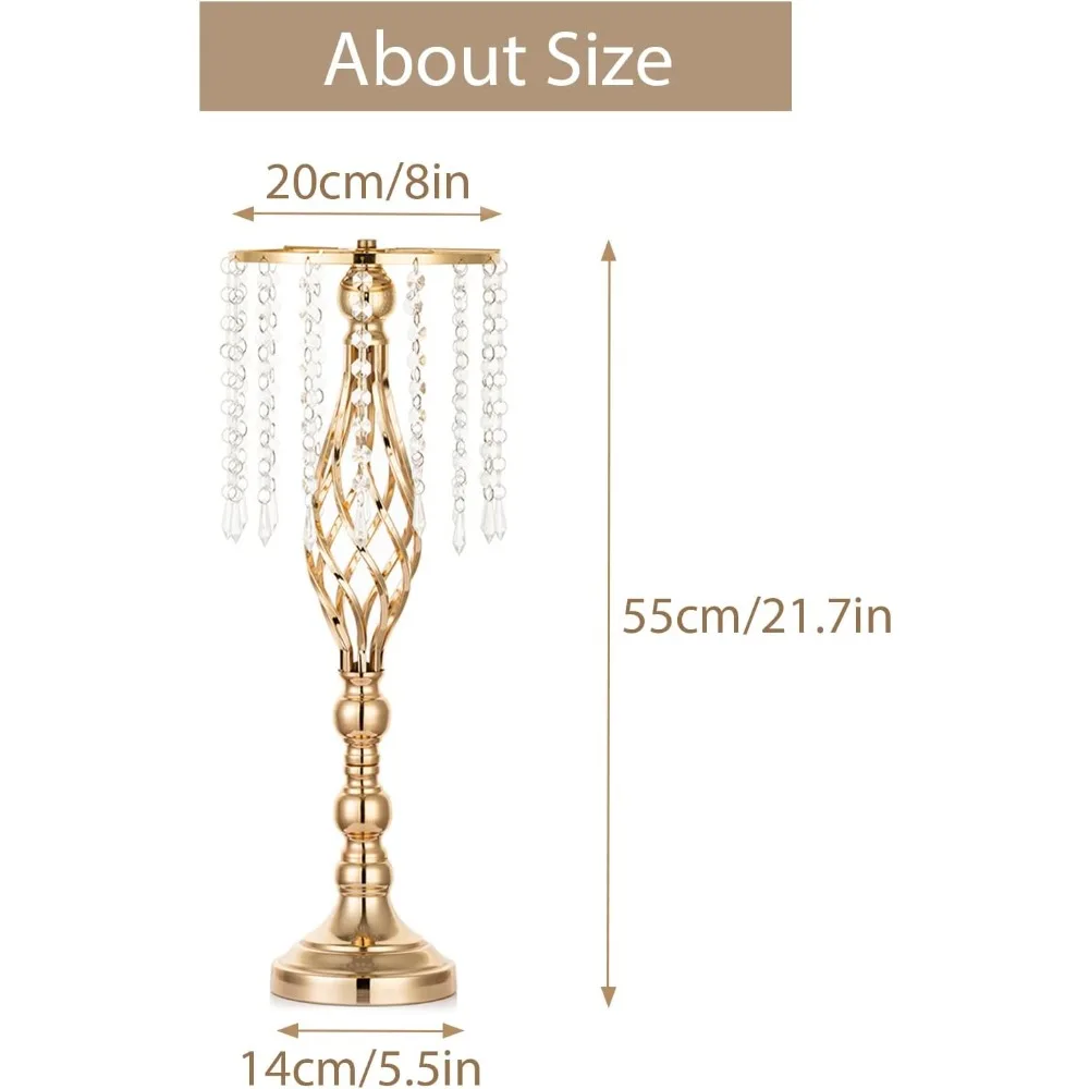This product features an elegant twist design, making it a beautiful and sophisticated centerpiece for various occasions such as weddings, parties, and events. The crystal beads add a touch of sparkle to your decorations, creating a stunning effect, especially when illuminated. The sleek and shiny finish of this centerpiece riser enhances its charm and makes it an eye-catching addition to any table setting, whether for a wedding, baptism, quinceanera, birthday, anniversary, or graduation. Its versatile design allows it to be used not only for special events but also for everyday home decoration or festive occasions. Available in two heights and two colors, this tall wedding centerpiece holder caters to diverse decorative preferences and creative ideas.