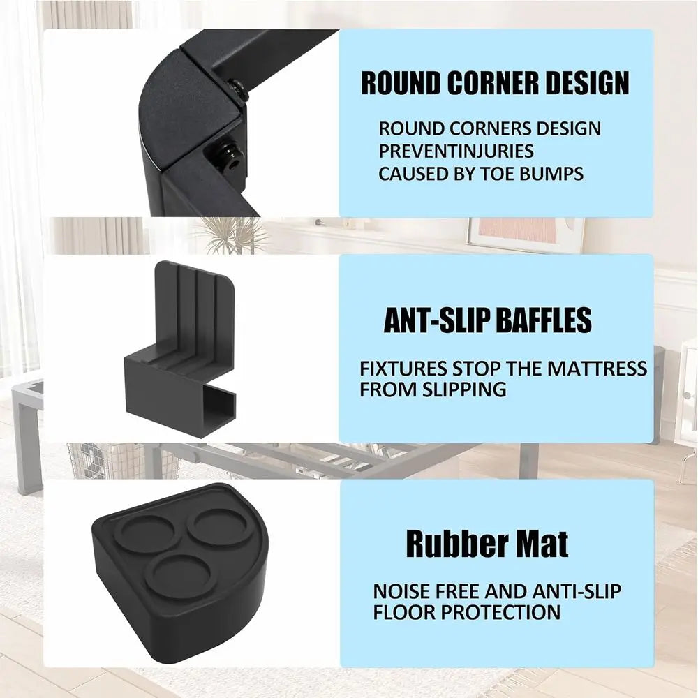 **4 PCS Non Slip Mattress Gaskets**: The bed frame comes with four non-slip mattress protection baffles that keep the mattress in place for sizes ranging from Twin to California King.