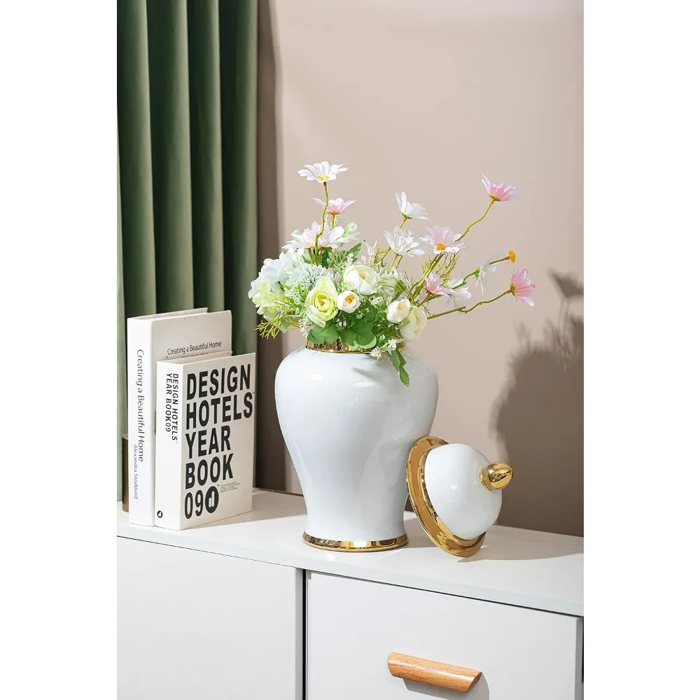 This Modern White Ginger Jar is designed to be the focal point of any room, especially when placed as a centerpiece on tables. It's perfect for creating a statement when grouped together. Versatile in its use, the Ginger Jar can be showcased individually or in clusters on various surfaces such as entryway tables, dining areas, buffets, and kitchens. Functioning as a vase, it's ideal for both fresh and dried flowers, as well as artificial leaves and other decorative fillers, holding water to keep plants fresh for an extended period. The jar's white and gold glaze offers a modern and fashionable display, making it an elegant addition to any home or office. Paired together, they create a chic and stylish presentation. The classic lidded jar in white gloss finish with gold trim adds a touch of glamour and style. Without the lid, it transforms into a striking vase. Measuring 8¼ inches in length and width, and standing at 15 inches in height (21 cm x 21 cm x 39 cm), this jar comes in safe packaging to ensure it arrives in perfect condition. If there are any issues, please reach out promptly. It makes for a perfect gift for various occasions such as holidays, birthdays, weddings, and more.