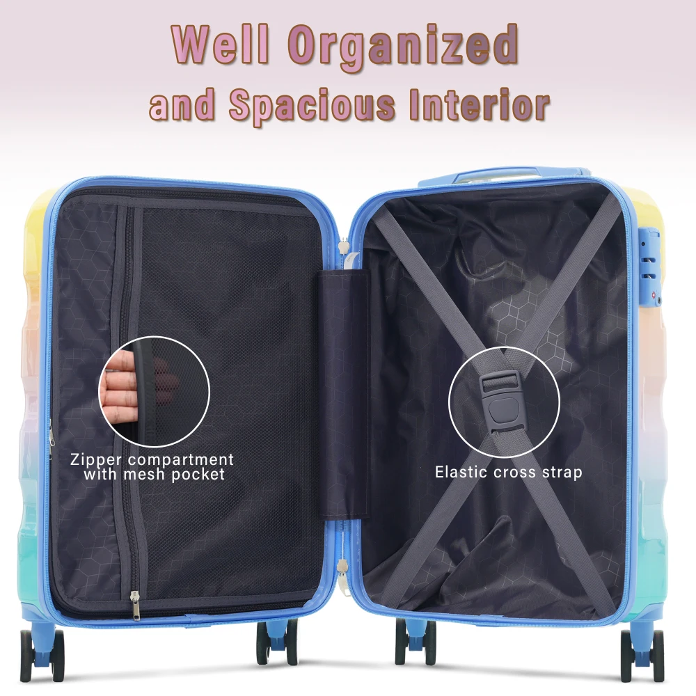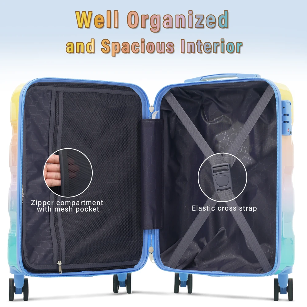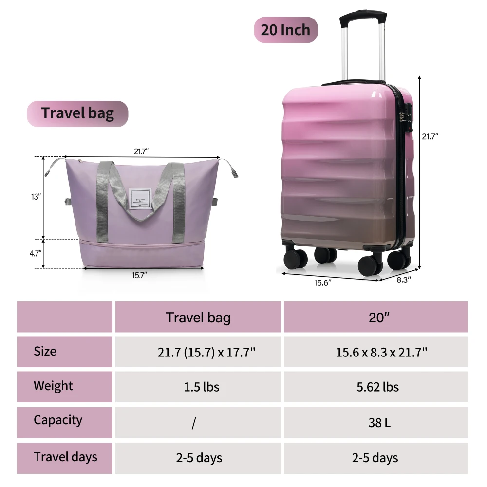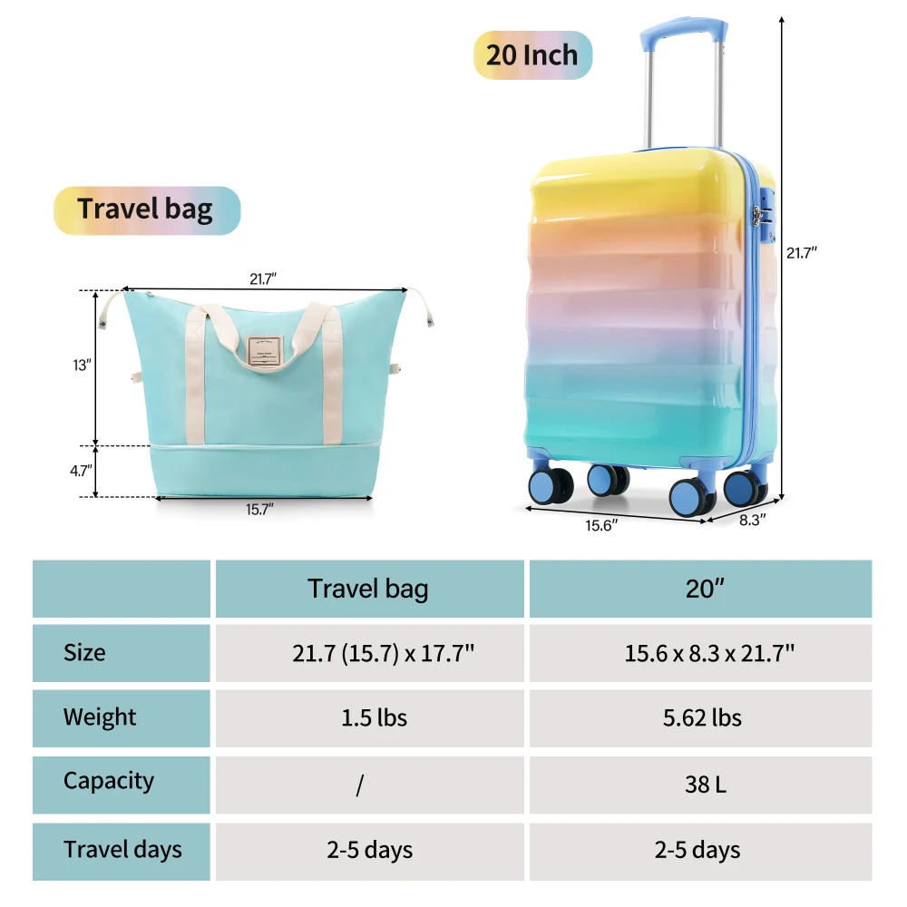 - The suitcase shell is made of ABS+PC material, which is sturdy and durable, offering excellent impact resistance and toughness, and can effectively withstand collisions and wear during travel. The high-gloss surface and gradient color design are stylish and eye-catching, making them easy to identify at baggage claim.