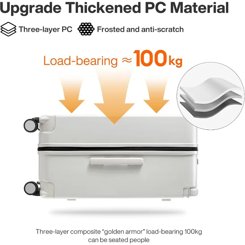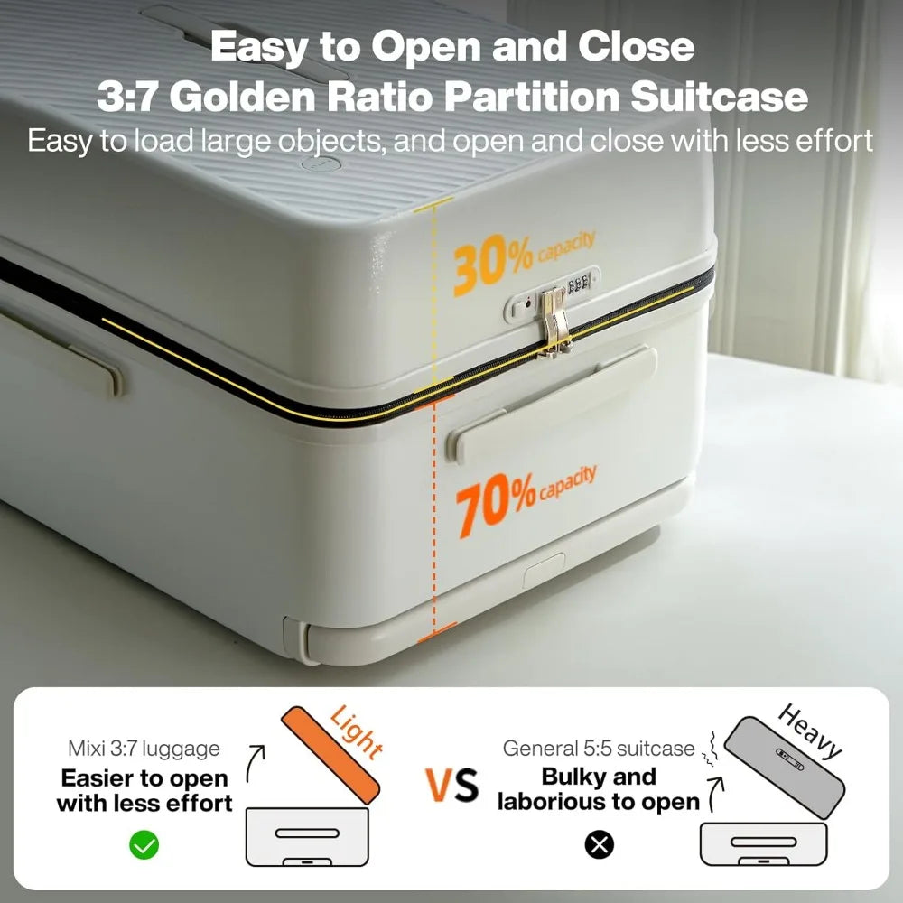 Here's a rewritten product description based on the provided information: --- This suitcase is crafted for longer trips, boasting a spacious 94-liter capacity that provides an additional 20% storage compared to standard luggage of similar size. The innovative 3:7 golden ratio design facilitates easy opening and closing, while the deep compartment is perfect for storing larger items. The suitcase features an upgraded wide handle design that ensures stability when loaded with items and enhances practicality. The handle is positioned at the edge of the luggage, thus not taking up any internal space, allowing for maximum utilization of storage capacity. Constructed from three layers of Covestro PC material, this suitcase is both lightweight and durable. It offers excellent scratch resistance and can withstand impacts, ensuring your belongings are well-protected during travel. High-quality accessories include a YKK zipper for long-lasting use, a TSA-approved combination lock that allows for hassle-free security checks in most international countries without damaging the suitcase, and high-precision dual-row spinner wheels with TPE rubber damping that absorb shocks for a silent and smooth glide. As a brand, Mixi prioritizes customer experience and aims to make every journey enjoyable with their products. They offer 24-hour customer service to ensure satisfaction. --- This description maintains the original meaning while rephrasing the content and omitting any special symbols.