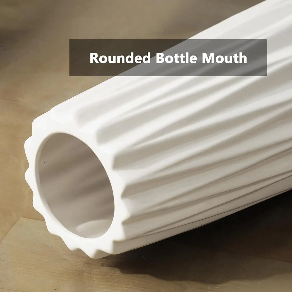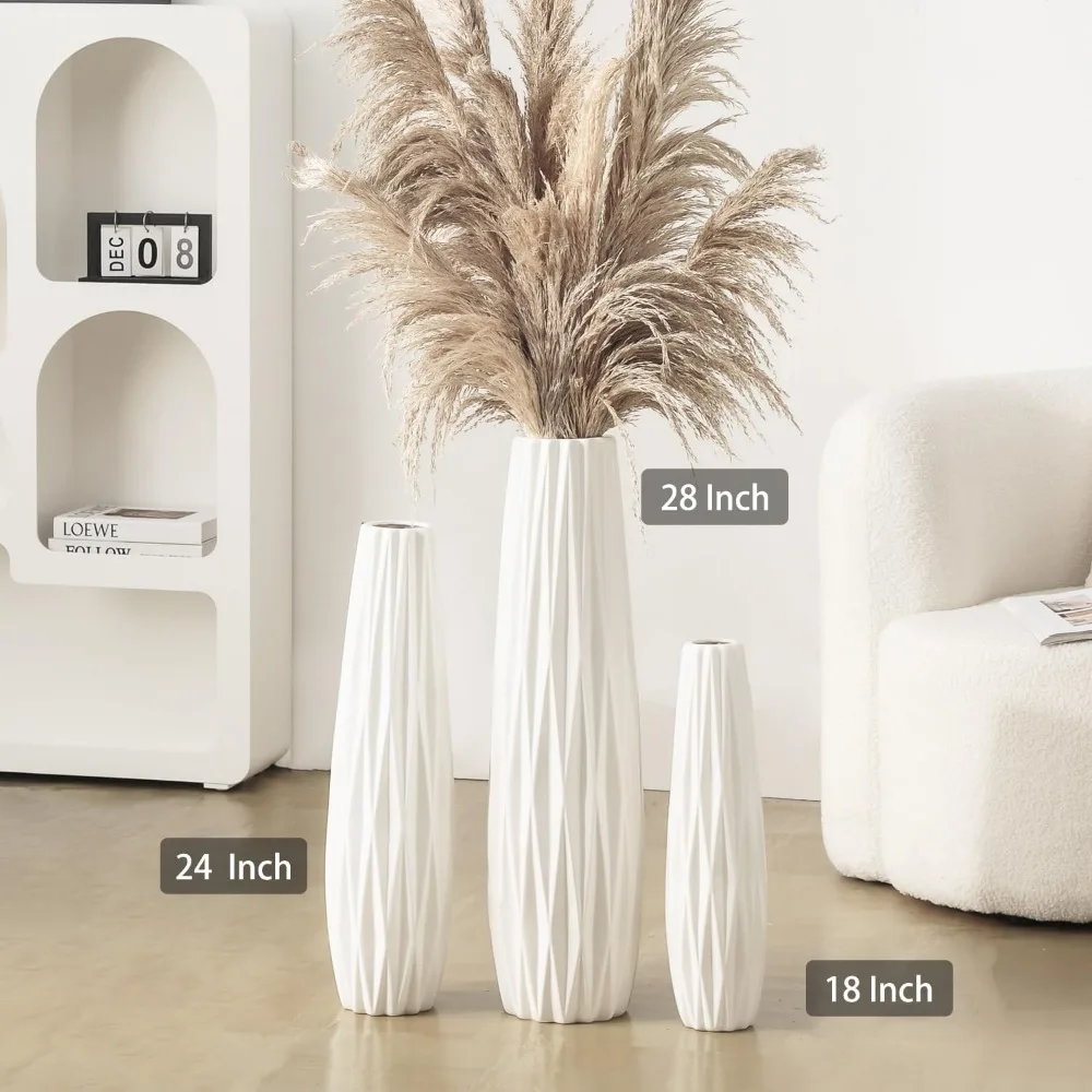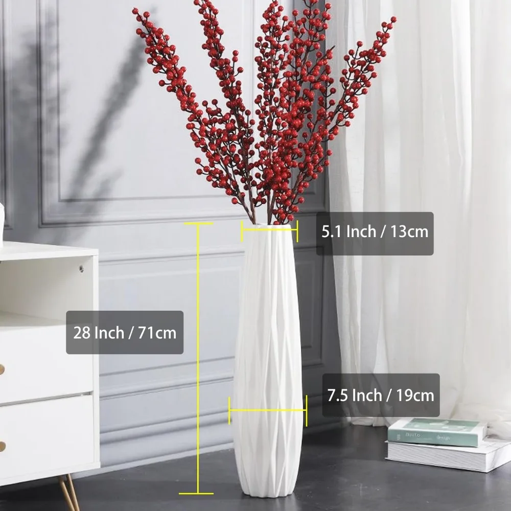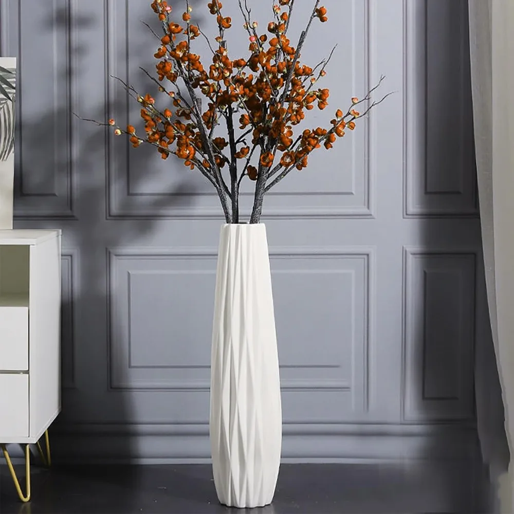 This large ceramic vase is crafted from high-quality ceramic material, featuring a textured base for enhanced stability and a smooth, glossy white finish with an exclusive origami line pattern. It does not have drainage holes, making it ideal for holding water and displaying flowers. Measuring 28 inches in height and 7.5 inches in diameter at its widest point, the vase's mouth is approximately 5.1 inches wide. It serves as an elegant decorative piece, perfect for showcasing branches, dried or fresh flowers, and can also be used as a standalone home accent. Versatile for various settings, this white floor vase can be placed in living rooms, bedrooms, offices, modern farmhouses, dining rooms, hallways, and more. It is a fitting choice for gifting on occasions such as housewarmings, weddings, Christmas, birthdays, and anniversaries. (Flowers not included)