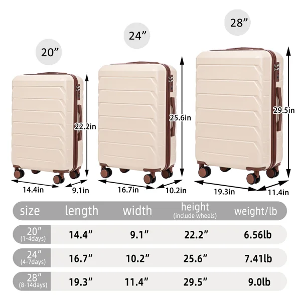 3 in 1 ABS&PC Trolley Box 20in 24in 28in Trolley Box Iron Tie Rod ABSPC Alloy Beige luggage travel bag suitcase set