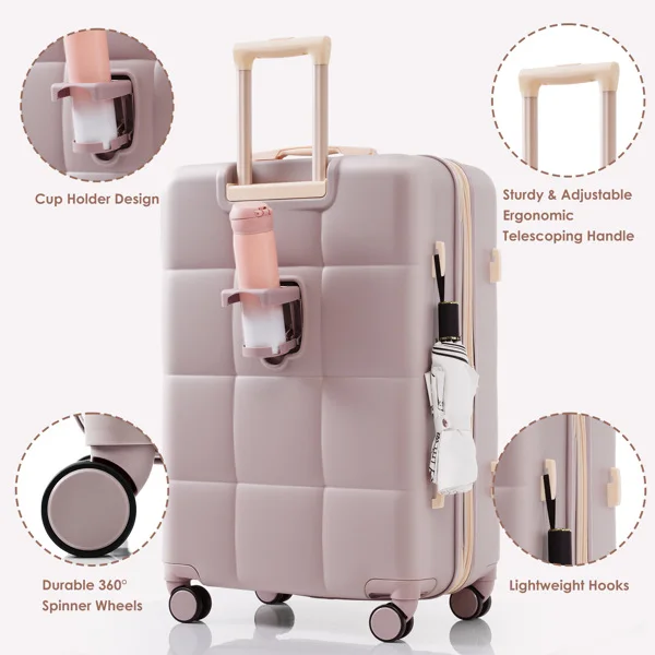 Both Suitcases Equipped with Cup Holders – Enjoy hassle-free travel with integrated cup holders on both the 20" carry-on and 28" suitcase, keeping your drink within easy reach during your journey.