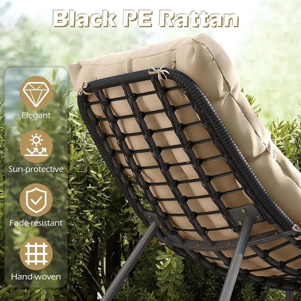 The high-quality PE wicker used in this patio bistro set is hand-woven, providing a timeless and elegant appearance. It is also fade-resistant and sun-protective, ensuring the set remains vibrant throughout the seasons. The sturdy metal frame offers strong stability and reliability, with each lawn chair supporting up to 400 lbs and the side table capable of holding 100 lbs.