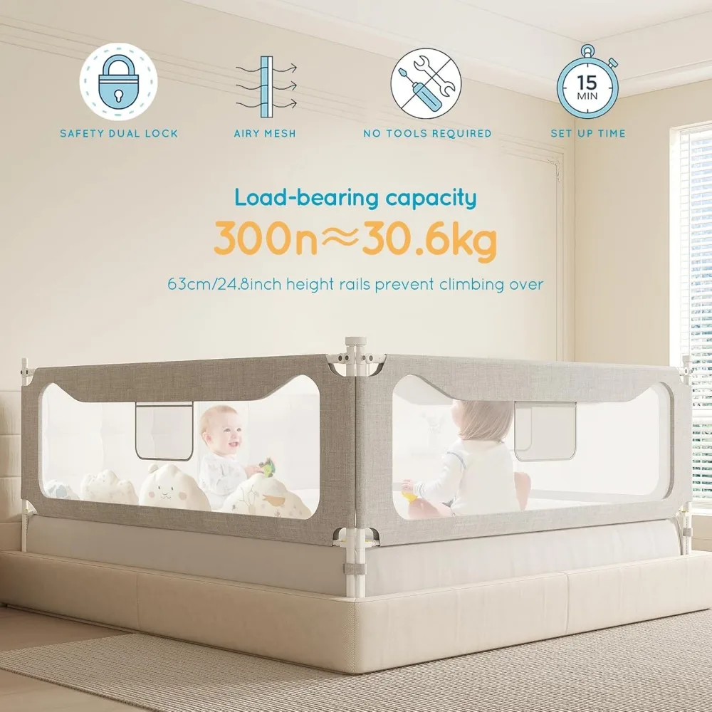 Here's a rewritten product description based on the provided information: --- Our toddler bed rails are designed with safety and convenience in mind. Made from high-quality polyester, these bed rails are tailored to fit king size toddler beds measuring 78.7x78.7x74.8 inches. To ensure the best fit, we recommend measuring your bed dimensions before purchasing. These bed rails feature a 3-sided design with an ultra-stable 4-point frame, providing enhanced security for your child. The integrated crossbar forms a secure enclosure that significantly reduces the risk of accidental roll-offs during sleep. The dual-button child lock system ensures that the bed rails cannot be accidentally opened by your child, while being easy for adults to operate. This design allows each side to be used independently for convenient access. The bed rails offer a seamless fit and can be customized to fit various mattress thicknesses up to 12.2 inches. With 30 adjustment positions, you can achieve a perfect, secure fit for your specific mattress. Constructed from heavy-duty steel, the bed rails offer exceptional structural integrity and maximum stability. This prevents wobbling or buckling, ensuring long-lasting, safe support for your child. The bed rail guard is made from durable and breathable mesh fabric that is tear-resistant and comfortable. The mesh is designed to be snag-free, protecting your child's delicate skin and ensuring long-lasting durability. For easy operation, the bed rail can be adjusted up or down with just one hand. The precision-engineered mechanism allows for quick and hassle-free adjustments, making it perfect for busy parents and those late-night comfort checks. --- This description maintains the original meaning while rephrasing the content and omitting special symbols.