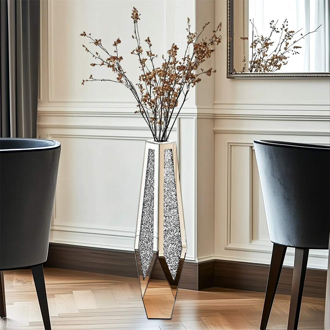 34” Tall Standing Flower Vase Crushed Diamond Mirrored Silver Glass Decorative Flower Vase Corner Vase for Home
