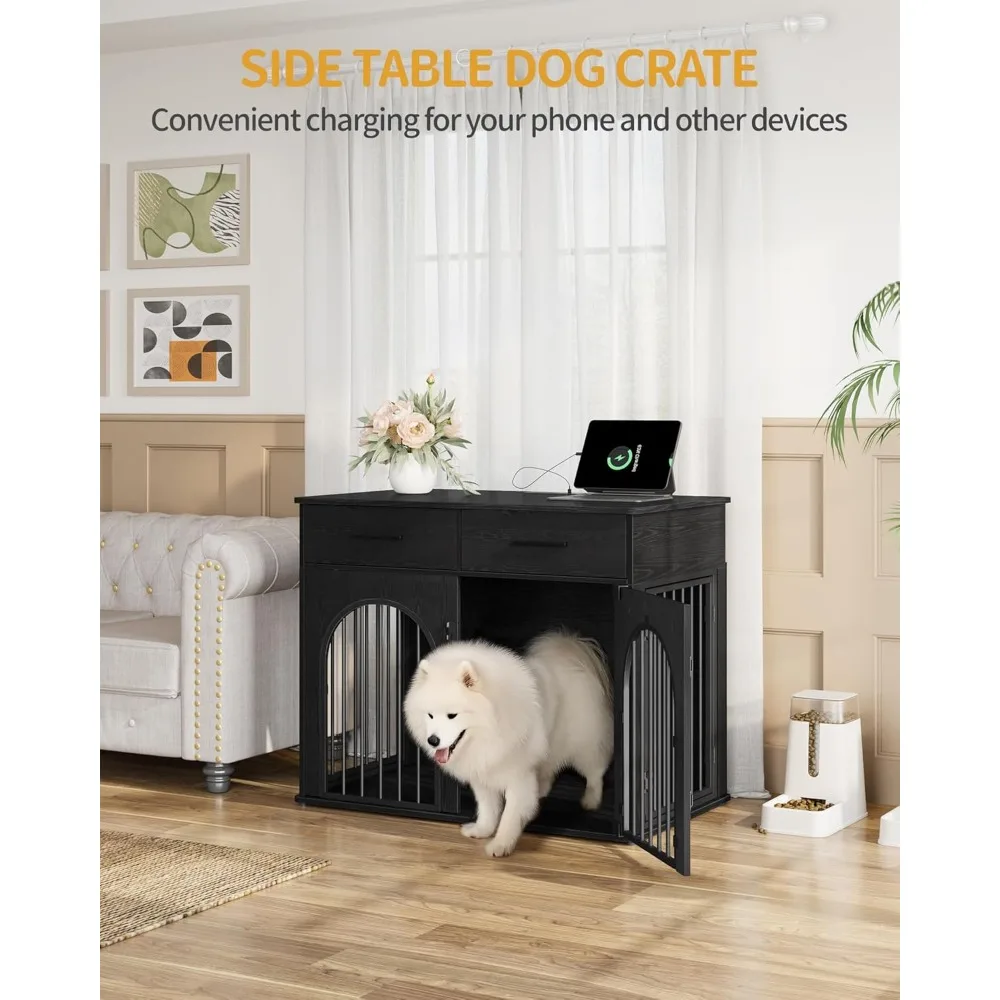 39.4'' large dog crate furniture with 2 storage drawers, heavy duty dog kennel indoor with charging station, wooden dog cage end