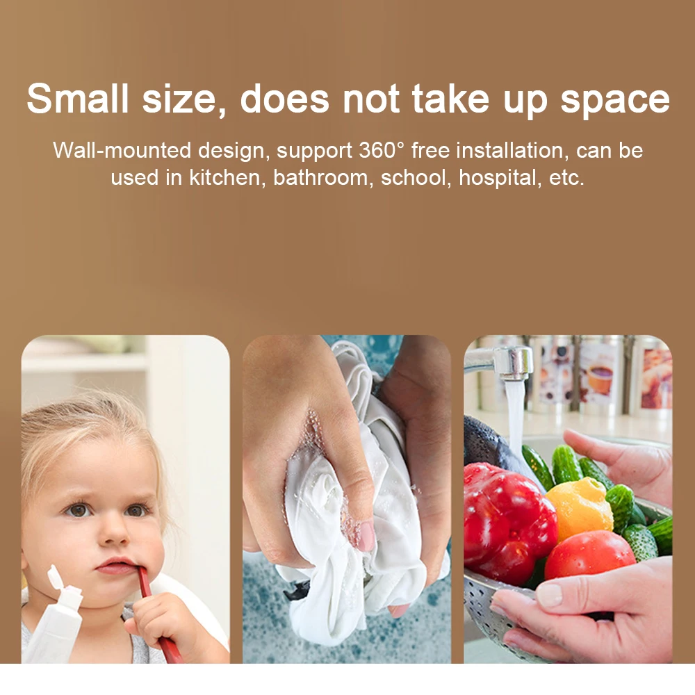 Small size, does not take up space. Wall-mounted design, support 360° free installation, can be used in kitchen, bathroom, school, hospital, etc.