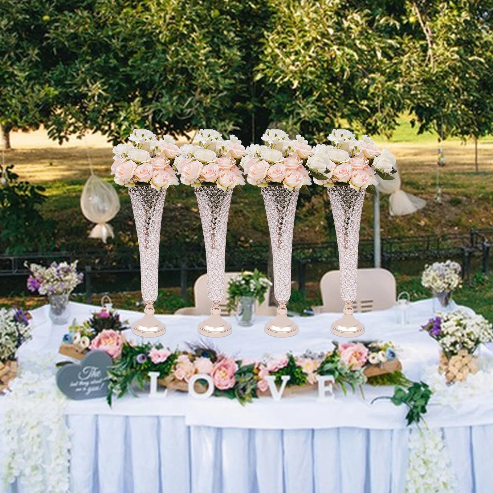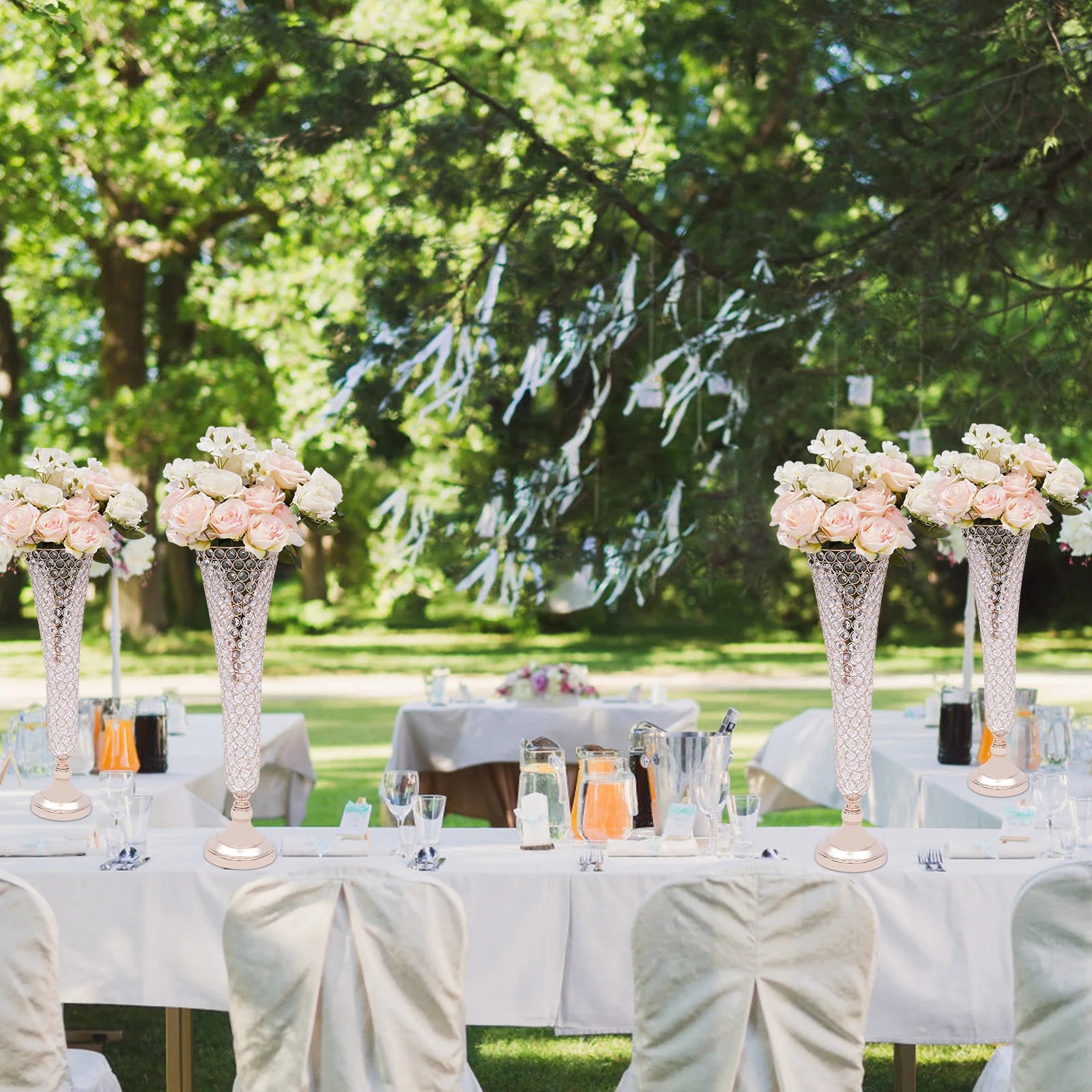 Brighten up dull wedding decorations, birthday centerpieces, party decorations, and dessert table decorations and impress your guests with your fabulous decorations - just use our alluring crystals trumpet floral vase. Each crystal sparkles in the sunlight, adding extra sparkle to make your wedding, party, or home even more luxurious!