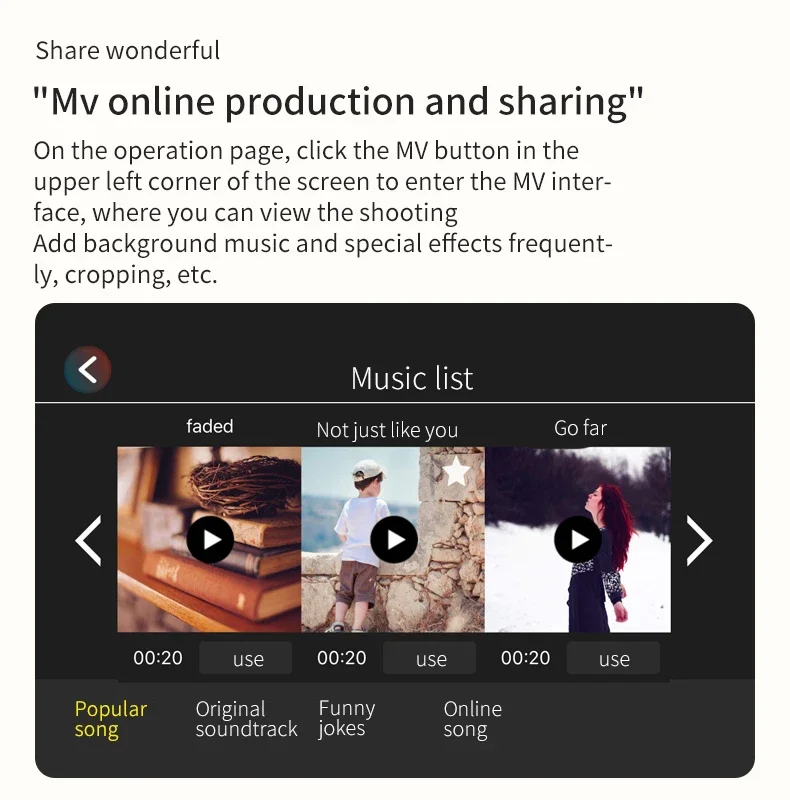 9. Picture, music and video sharing can be added: single or multiple selection to share photos, videos can only be shared individually at a time.
