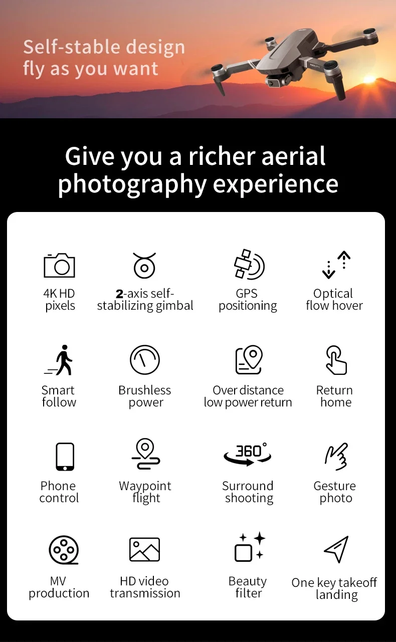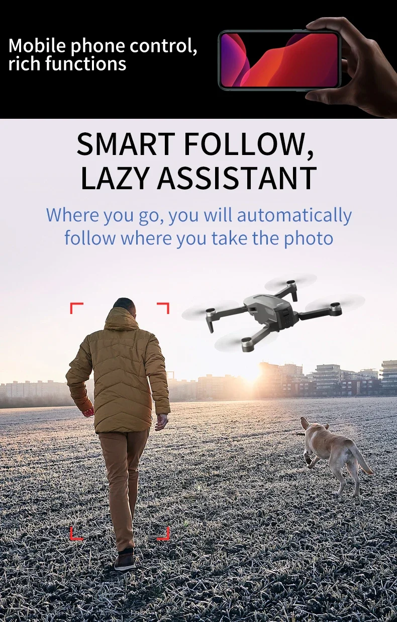 10. One-button takeoff on the remote control/mobile phone follow/mobile map site flight/landing/return (the lens will be aimed at the operator when returning home), which is convenient for the operator to control