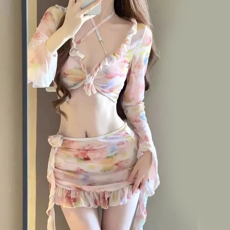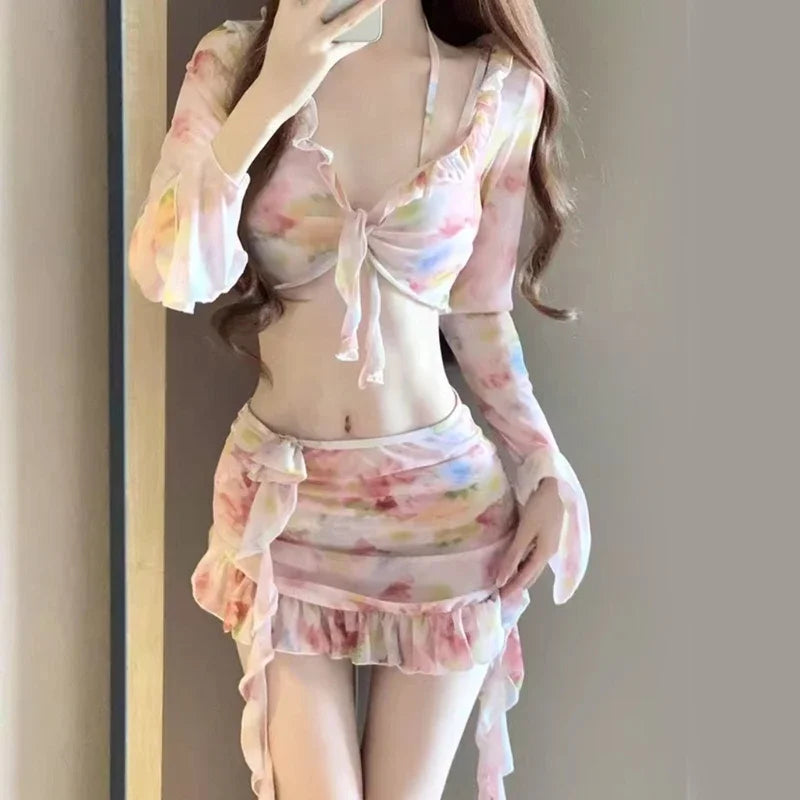 halter neck bikinis two pieces swimsuit, long sleeve mesh crop top, and ruffled bikinis cover up skirt.