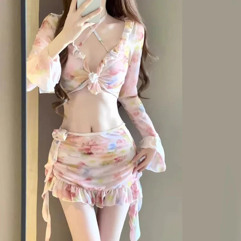 1 Piece Ruffled Long Sleeve Crop Top and Ruffled Beach Bikinis Wrap Skirt