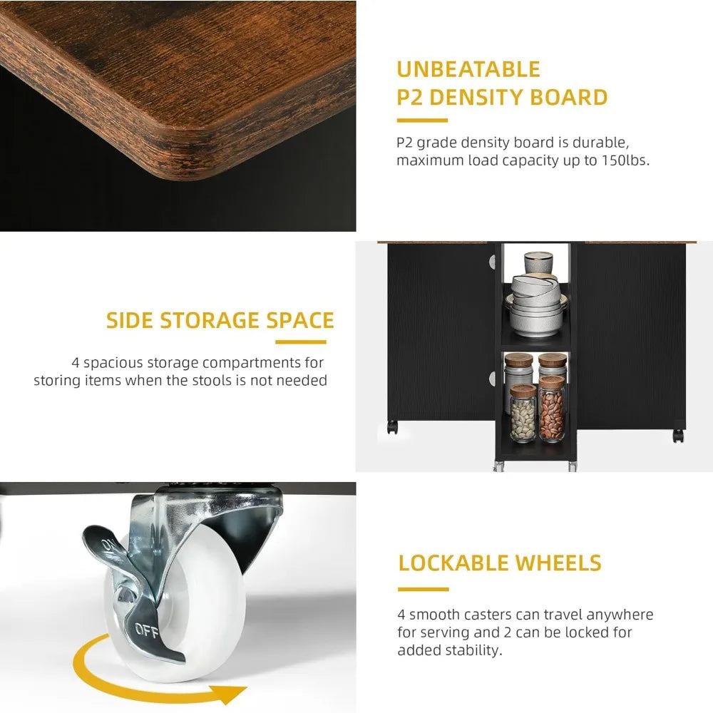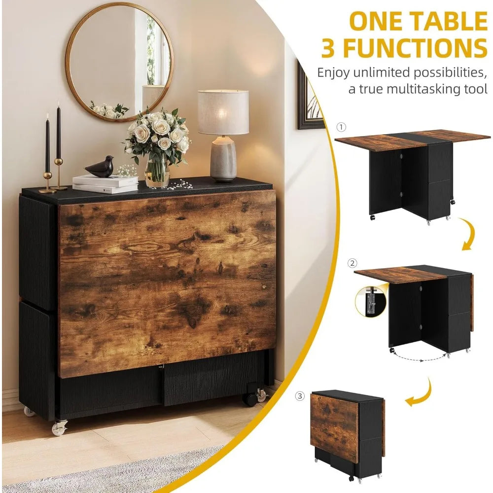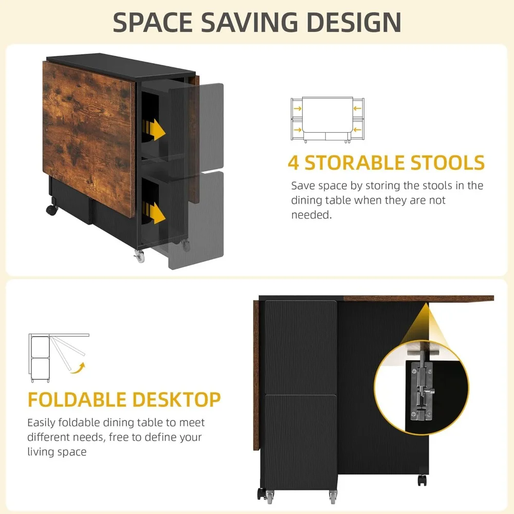 This product is a versatile engineered wood table set that includes one folding table and four chairs, designed for high durability and functionality. The table set is suitable for various settings such as homes, kitchens, living rooms, and dining areas. The table has dimensions of 12.99"L x 31.69"W x 29.5"H when folded and 55.1"L x 31.69"W x 29.5"H when expanded. The chairs have dimensions of 13.38"L x 10.2"W x 15.74"H. The table is a folding multi-use design that can be easily converted from a small table to a full-size dining table for four or a side table for two to three people. It features drop leaves with hidden buckles for securing the table plates. The table set is space-saving and comes with storage cabinets for the four chairs. When not in use, the table can be folded and stored in a corner, making it perfect for small living spaces like apartments. The built-in storage cabinets are ideal for organizing kitchenware, books, stationery, and more, helping to maintain a tidy kitchen or living room. Made from thickened high-grade engineered wood, the table top is sturdy and stable, featuring an attractive wood grain finish that is both durable and easy to clean. The table set can fit into different environments, whether at home or in the office, and is designed to meet various needs and make life easier. Assembly and movement are made easy with labeled components and clear instructions. The extendable kitchen table is equipped with six casters, including two lockable ones, for easy mobility around the home. The flexible casters on the moving board facilitate the expansion and folding of the kitchen table.