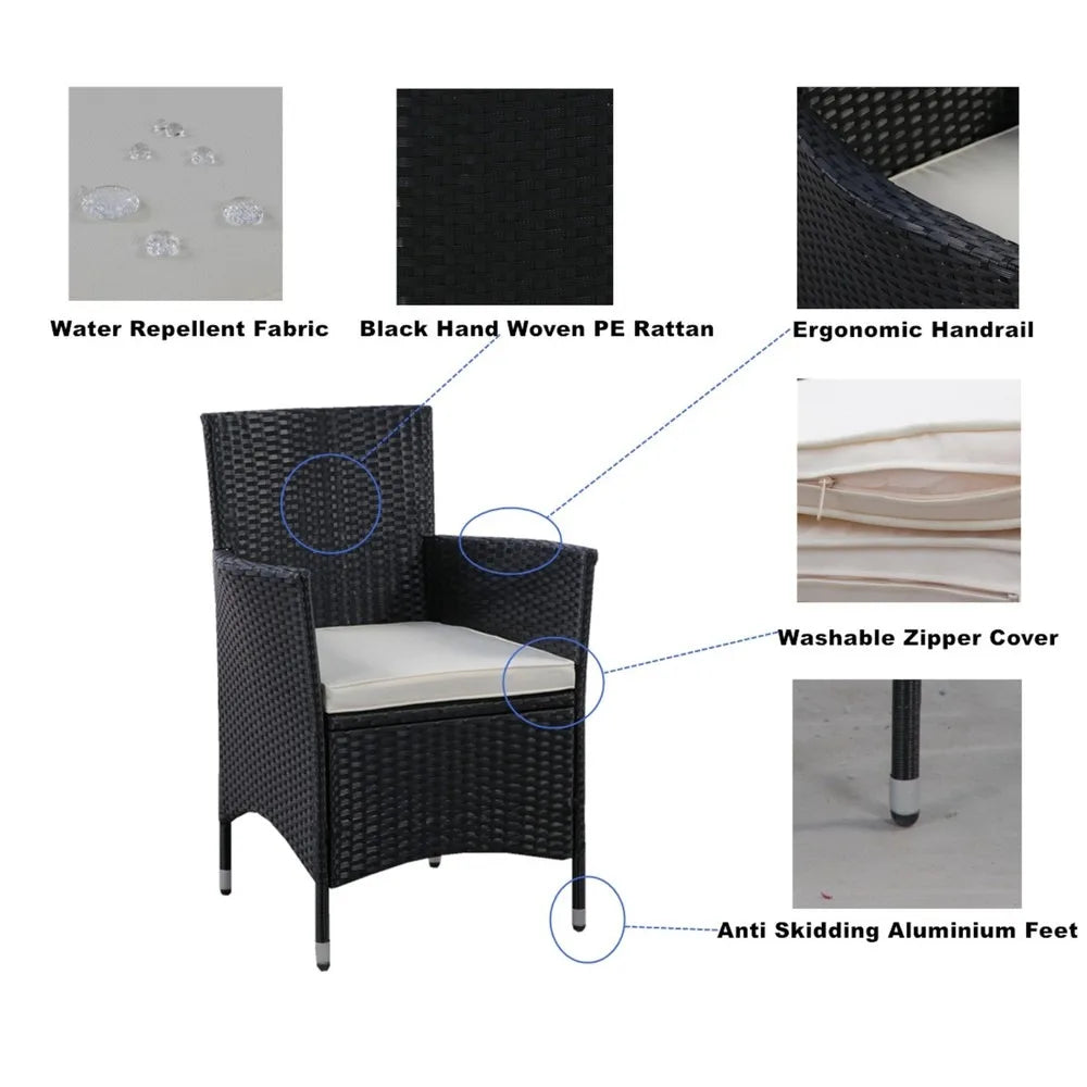 This 5-piece patio dining set is an excellent option for small-scale socializing or family dinners, comprising four rattan-style chairs and a square table that exudes practicality and sophistication.