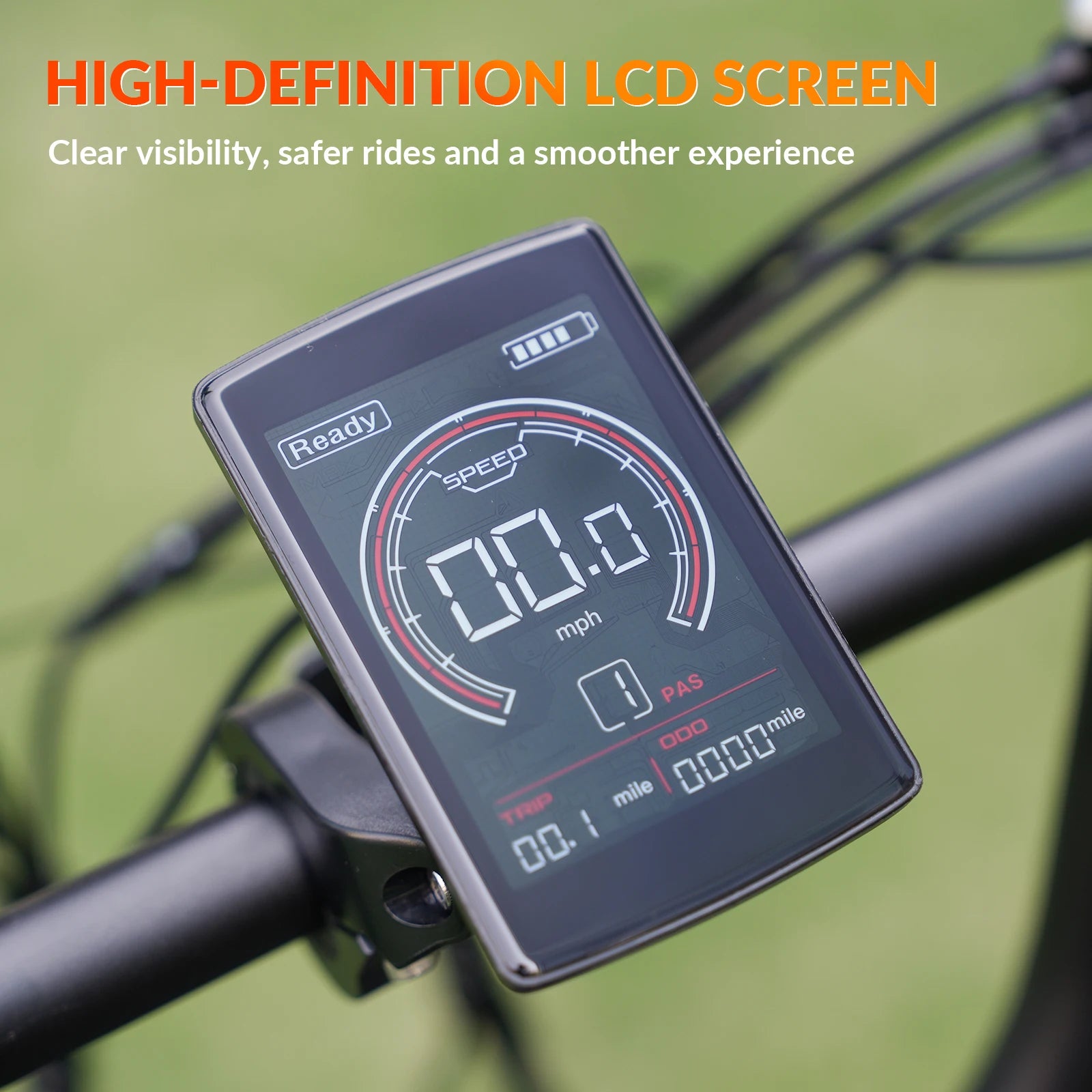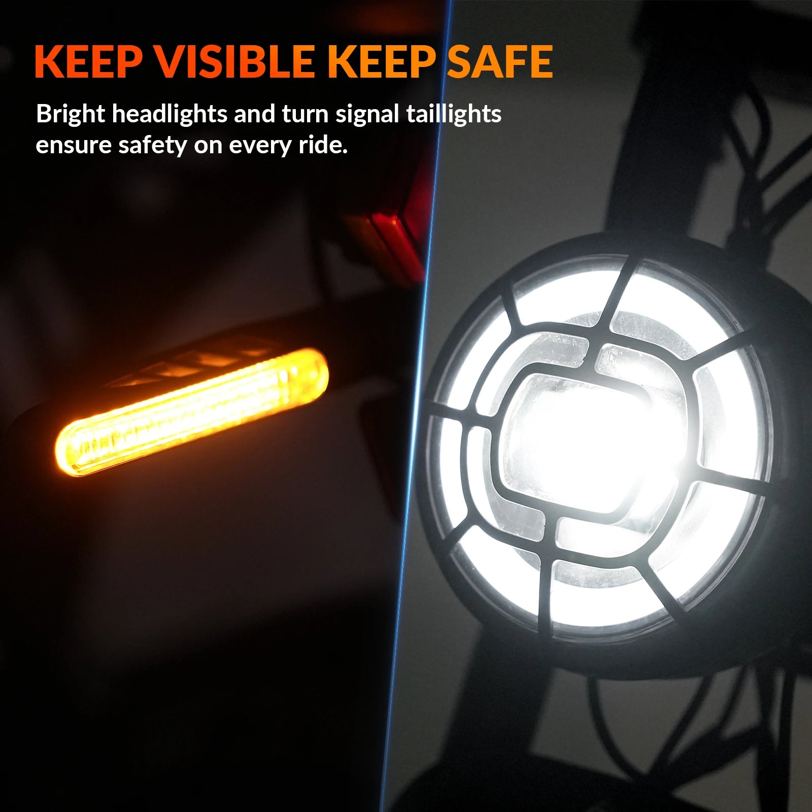 Stay informed and visible with an intuitive LCD display showing speed, battery level, and gear status. The integrated safety lighting system includes front/rear turn signals, bright LED headlights, and taillights for clear visibility and safe night riding.