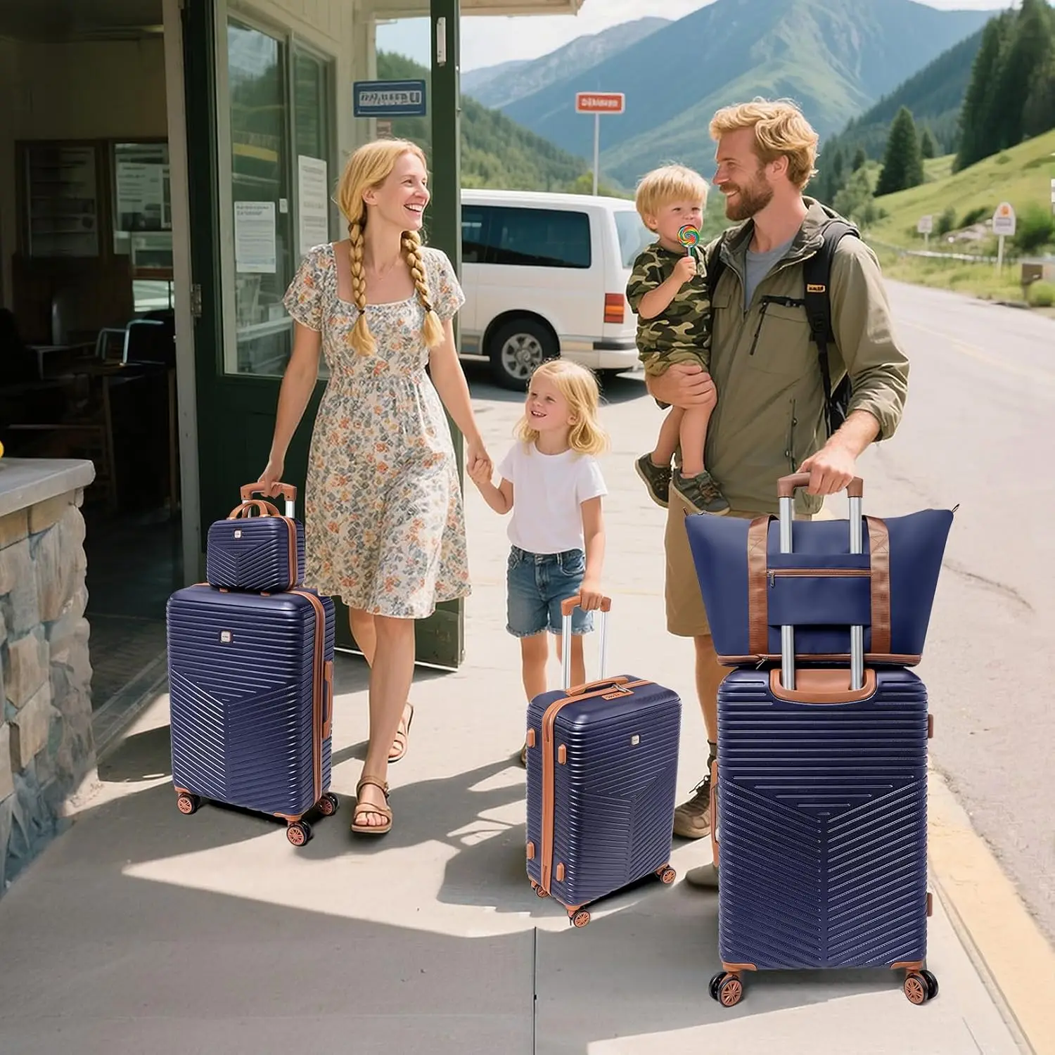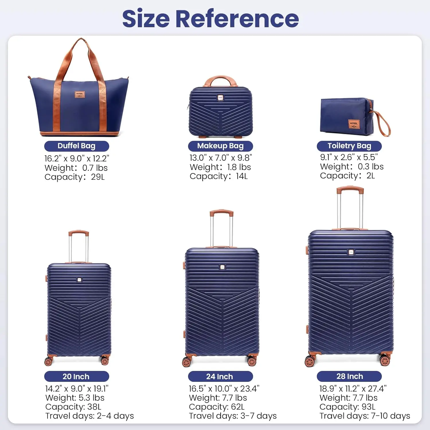 【6-Piece Luggage Set】Includes 20’’(carry on)/24’’/28’’(checked) hardshell suitcases + foldable duffel bag + toiletry bag + cosmetic case. All nest compactly saving 70% storage space
