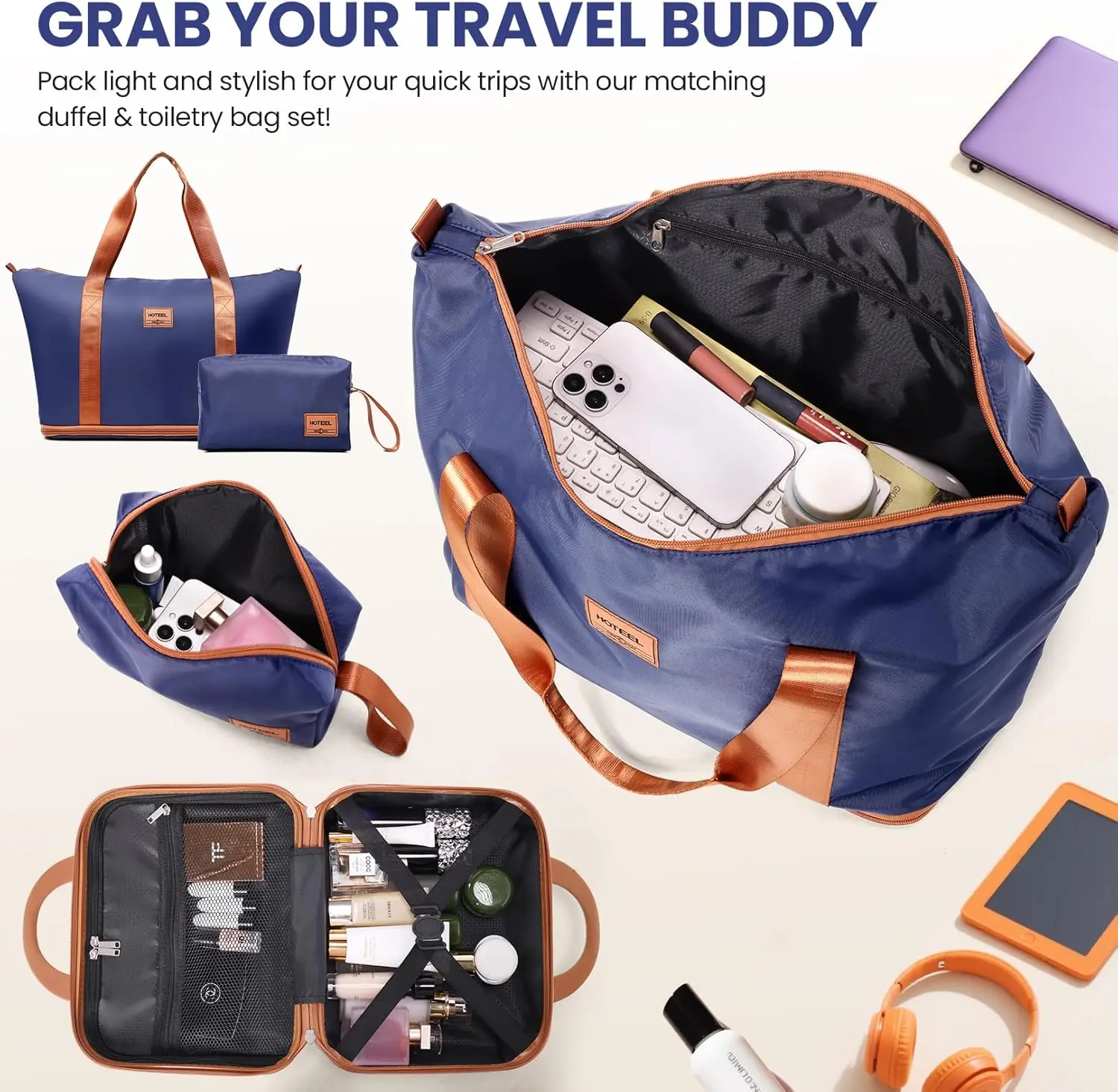【Expandable Duffel + Smart Storage】Featuring expandable duffel bag with isolated wet/dry compartments (+20% capacity), attaches to luggage via trolley sleeve. Toiletry bag for compact storage + larger cosmetic case with multi-pocket organizatio