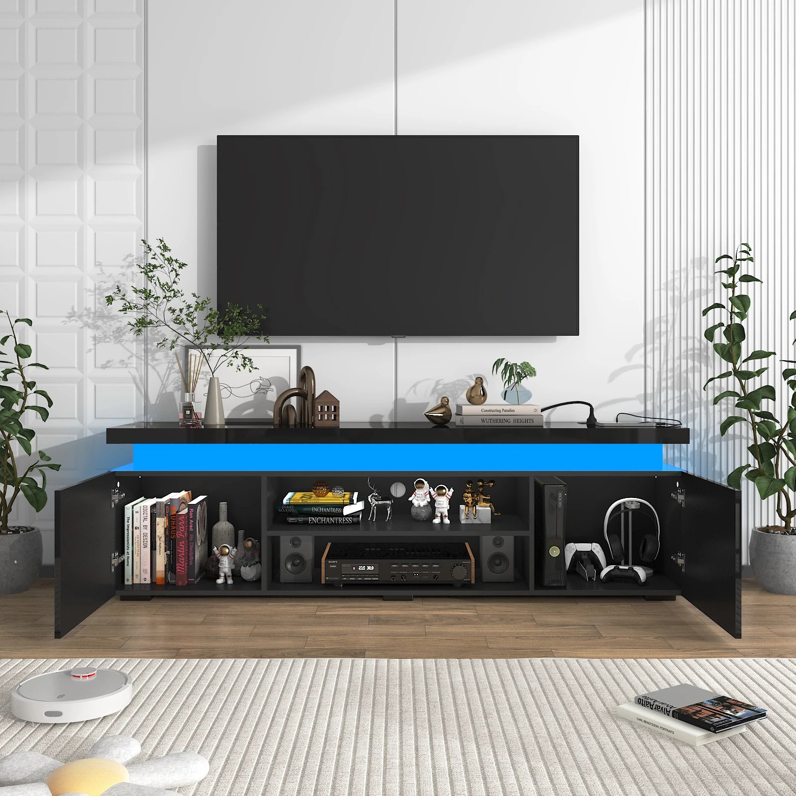 66 Inch LED TV Stand for 70/75 Inch TV, Modern Gaming TV Cabinet with Power Outlet, High Gloss Entertainment Center with Storage