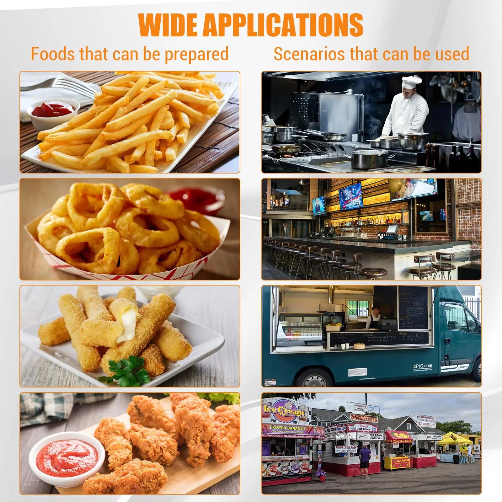 Wide Application: Perfect for frying French fries, fish, chicken, donuts, doughnuts, onion rings, shrimps, French fries, etc. It can be used for home cooking or commercial use to open your food stall.