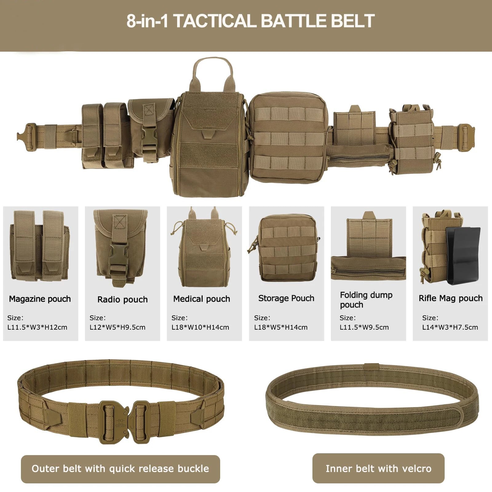 8-in-1 Hunting Tactical Battle Belt with Accessories Tactical Combat Belt Quick Release Rigger Belt Heavy Duty Belts 8 Pcs