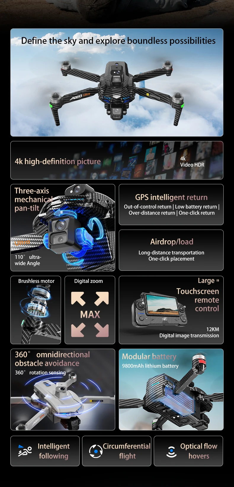 5G relay brushless motor+strong wind resistance+laser obstacle avoidance+4K three-axis pan tilt camera+11.4V 9800mAh large capacity battery+800g airdrop