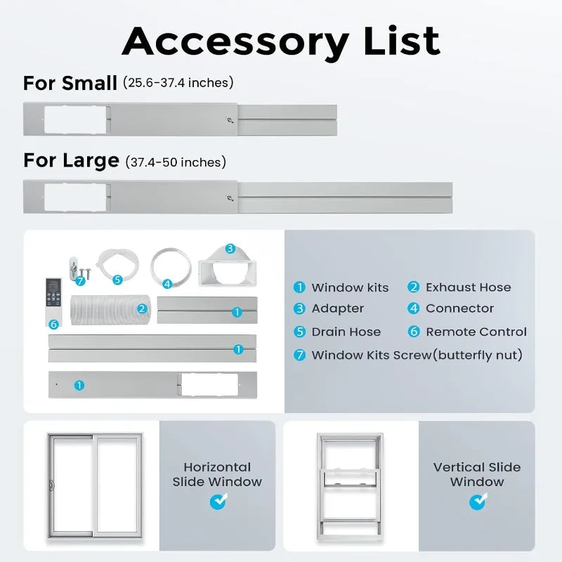 Upgraded Window Kit for Hassle-Free Installation: Our upgraded air conditioner portable now features a three-piece window sealing kit, replacing the previous two-piece design. The long panel fits 37.4"-50" windows, while the short suits 25.6"-37.4" ones. This thoughtful update minimizes the need for cutting, making installation easier and more user-friendly
