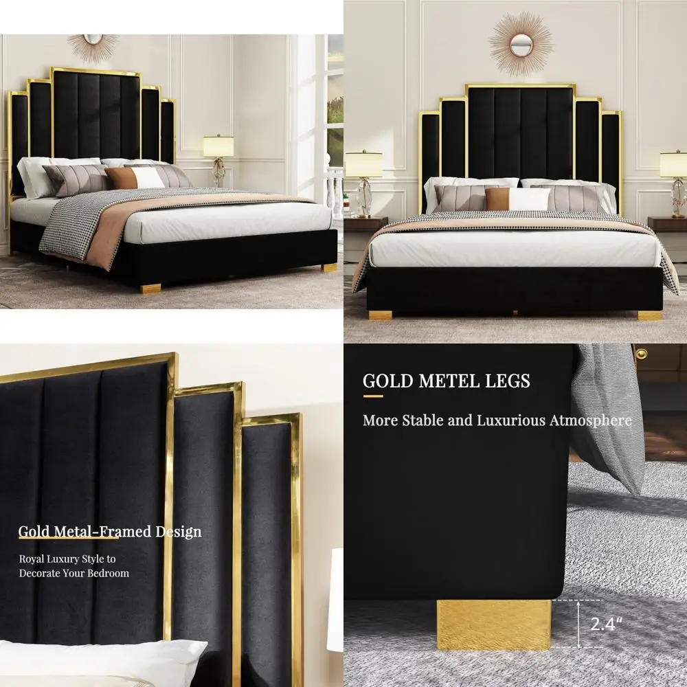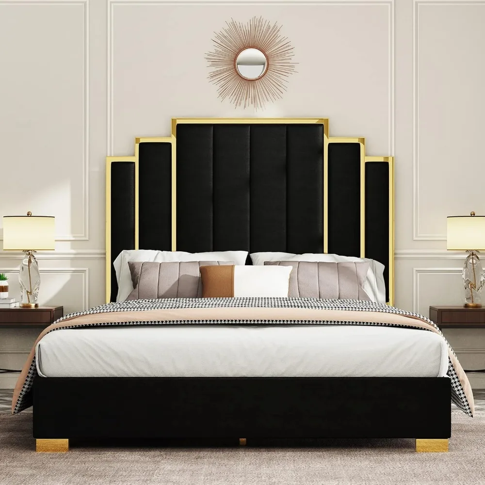 Albott Queen Size Platform Bed Frame, 61.4 Velvet Upholstered Bed with Gold Trim Headboard/Wooden Slats/No Box Spring Needed/Bla