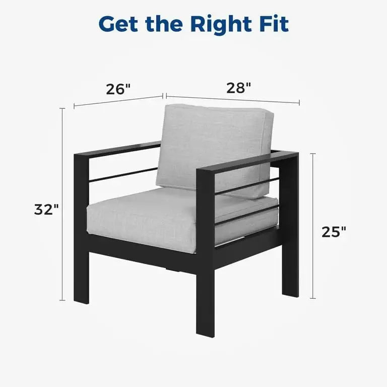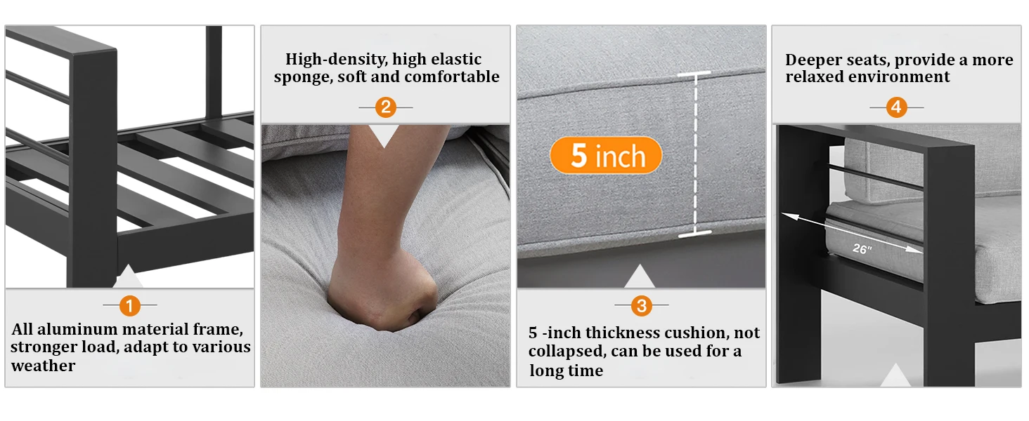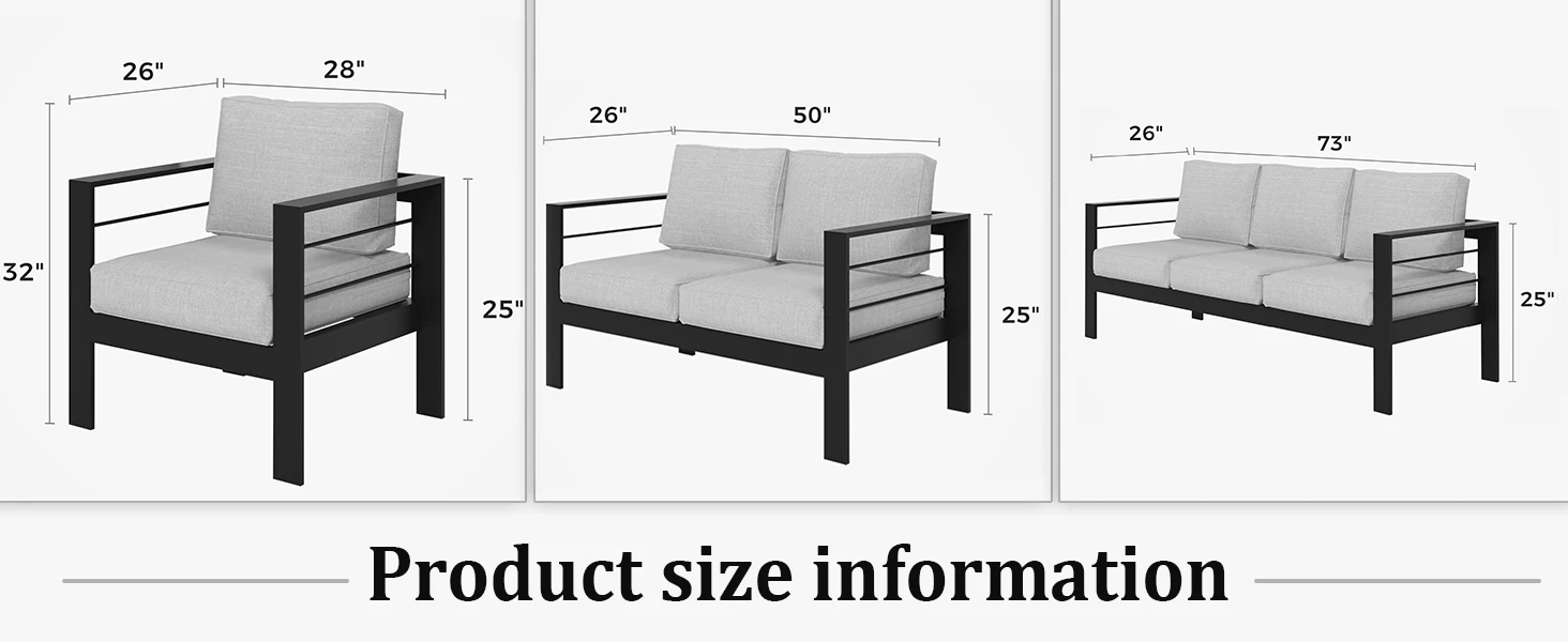 2. 【Premium Material】: The outdoor patio furniture uses an all-aluminum frame structure, which is very strong, and the frame broadens the armrest, making it have stronger support. The single seat can bear 300LBS. It can be placed outdoors all weather, has a long service life, is waterproof and rust resistant, even can resist risks even in harsh conditions. Note that if couches for patio are placed in the rain for a long time, you ‘d better shelter with furniture covers for using more years.