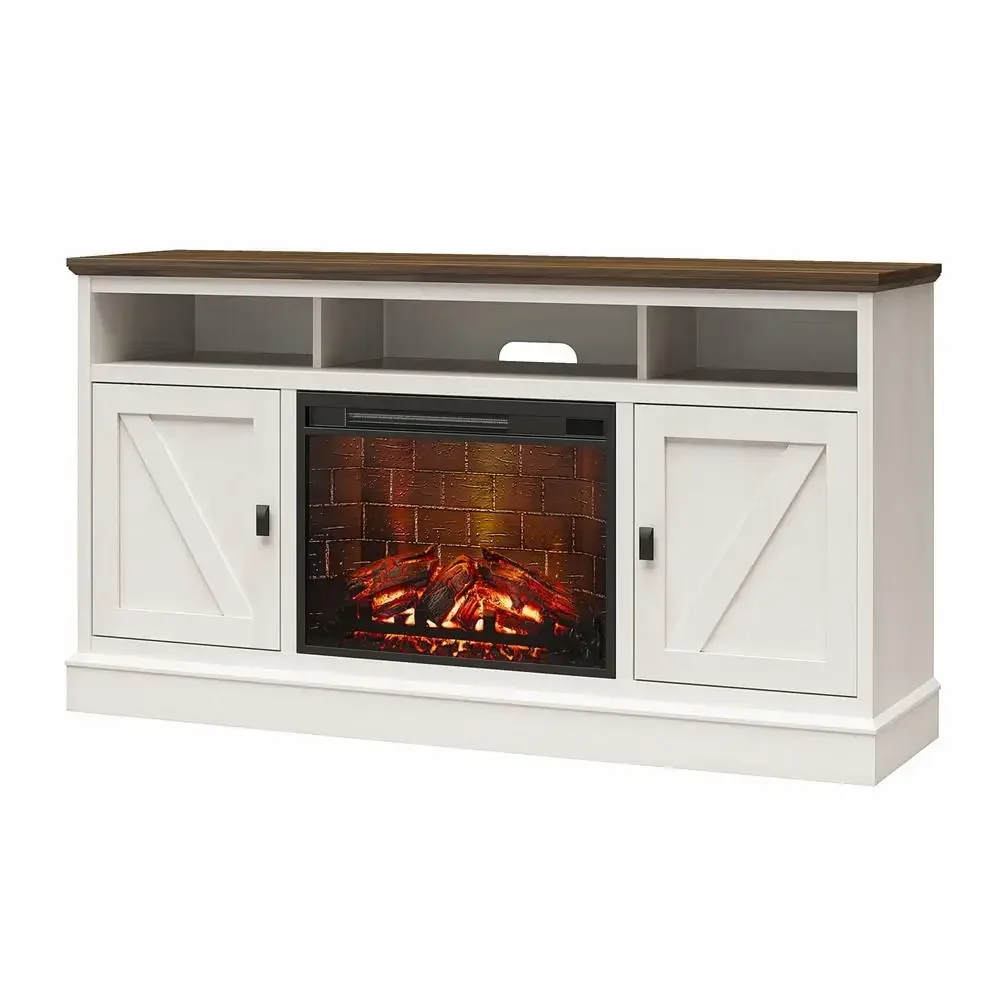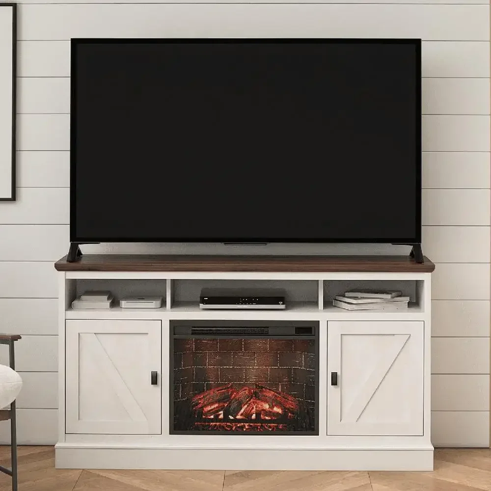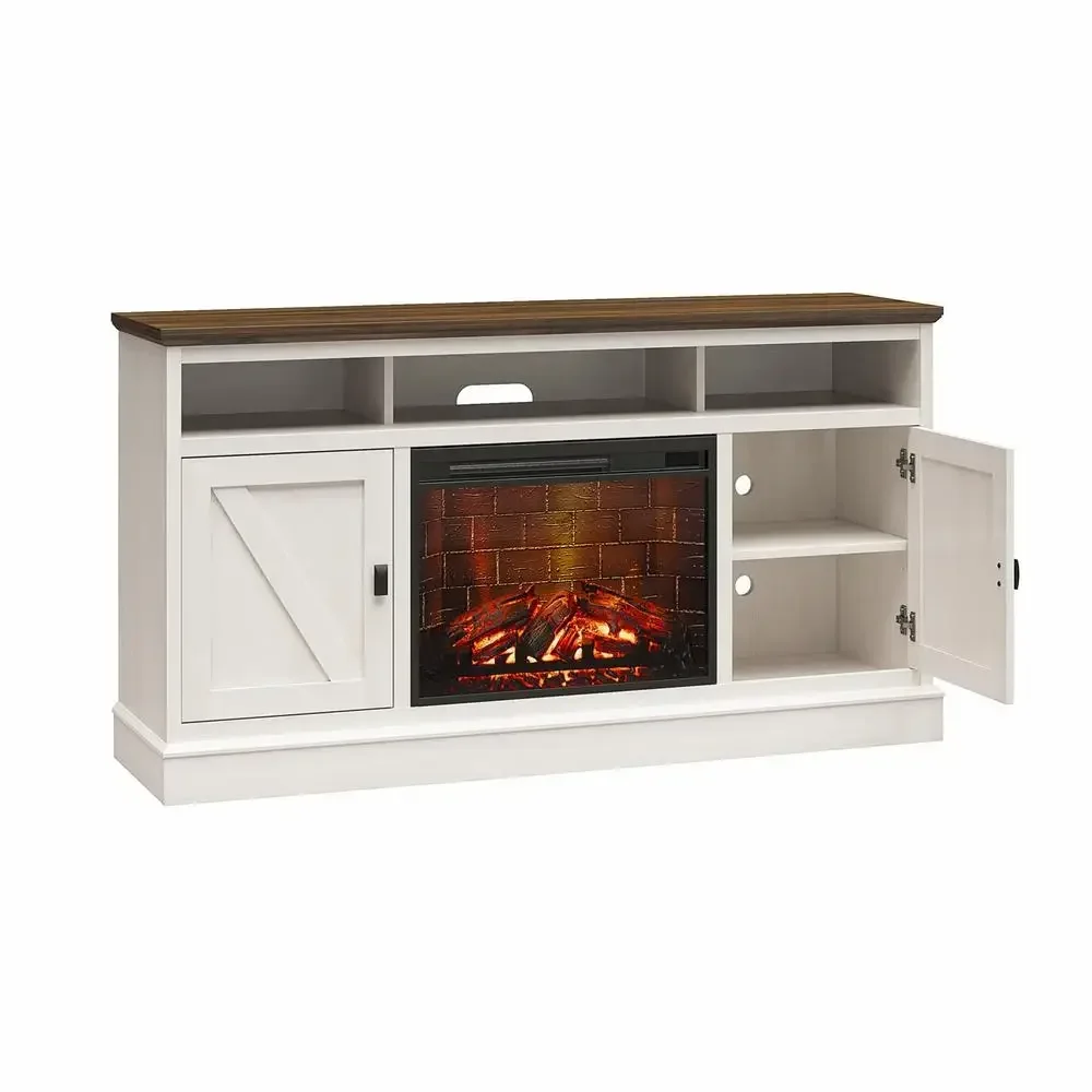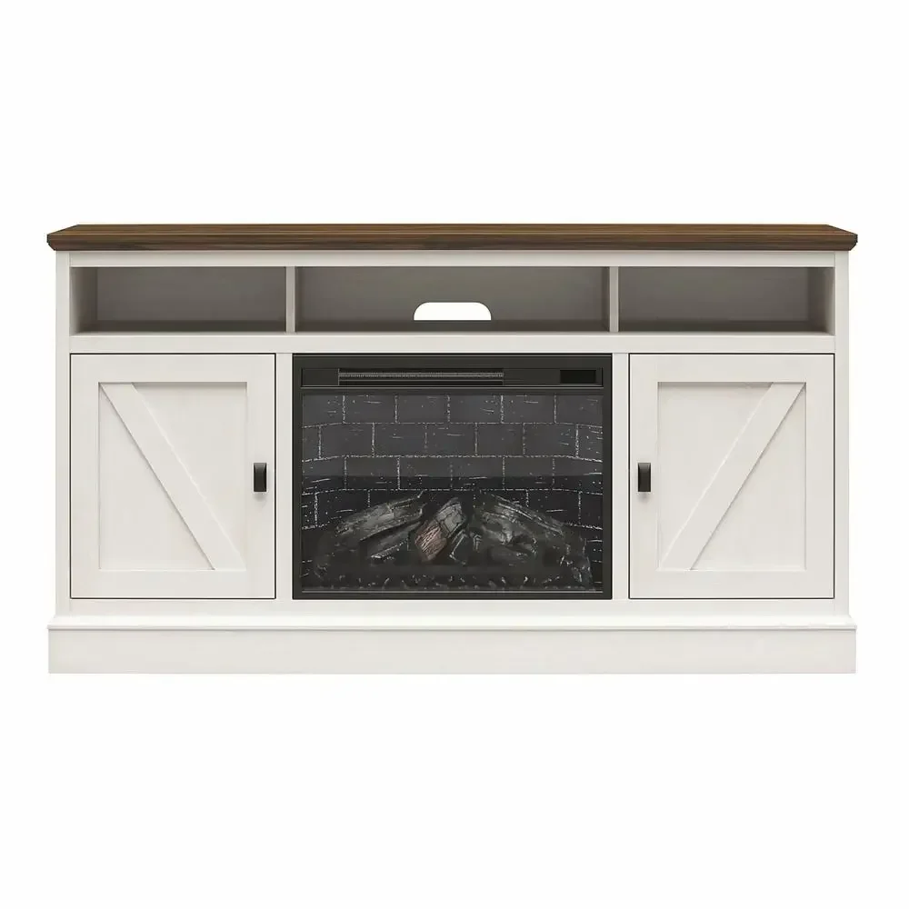 AFFORDABLE MODERN FARMHOUSE DESIGN: Elevate the ambiance of your home with the Ameriwood Home Ashton Lane TV Stand with Fireplace; featuring open and closed storage and wire management 23" ELECTRIC FIREPLACE INSERT: Fireplace heater can be enjoyed with or without heat, and features timer function, 11 heat and 4 brightness levels, touchpad display, realistic LED flame with included infrared remote complete with AAA batteries MORE TO LOVE: Replacement inserts can be ordered as needed; Insert uses a standard plug, heats a room up to 400 sq. ft. with 50,000 hours of life, 4600 BTUs, is CSA certified with overheat protection, auto shutoff, and cool touch tempered glass front SHIPPING & ASSEMBLY: The TV Console with Fireplace ships in one flat box and requires two adults to assemble; Dimensions: 58" W × 15. 75" D × 31. 125" H; Rated to accommodate most flat screen TVs up to 65", up to 70 lbs. S. Brand: Ameriwood Home