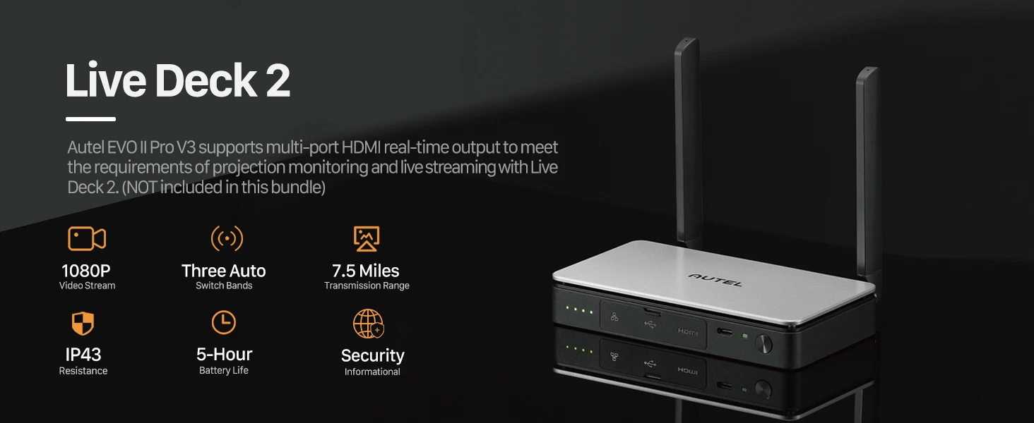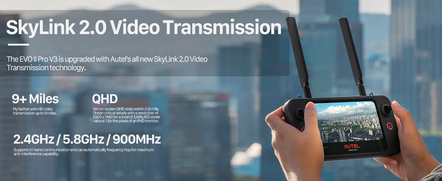 【Autel Skylink 2.0: Crystal-Clear Video at a 9-Mile Range】Push your creative boundaries with the EVO II Pro V3. Its advanced transmission system now reaches up to 9 miles, offering unparalleled freedom. Supported by intelligent tri-band (2.4/5.8/900MHz) frequency hopping, it guarantees a stable, high-definition live feed and maximum resistance to interference, empowering you to fly with total confidence.