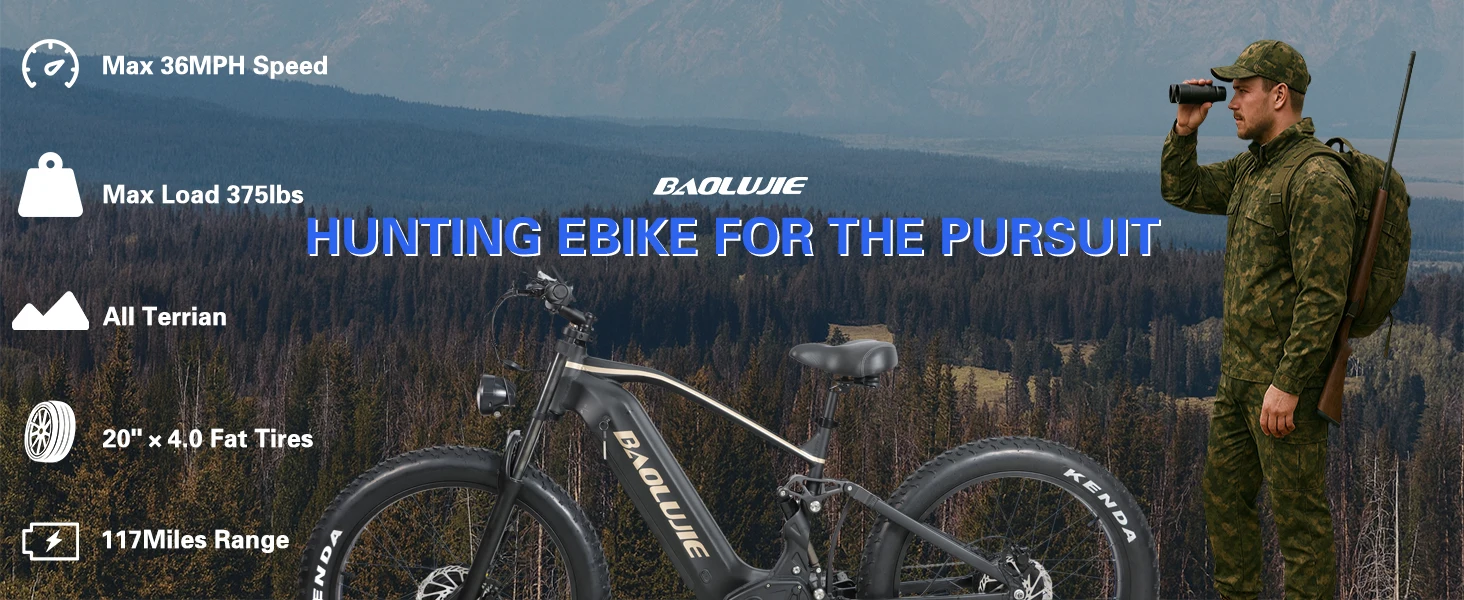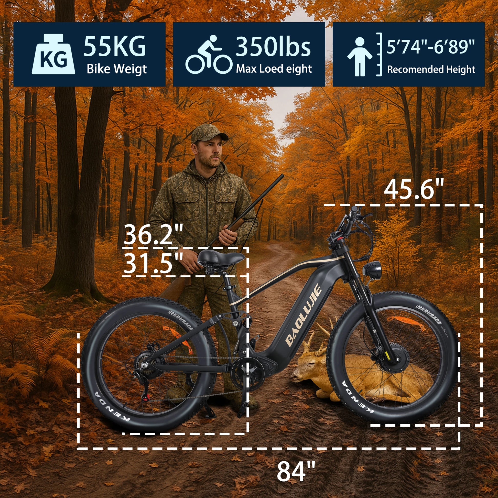 STRONG FRAME AND TIRES: Electric hunting bike 26 inch aluminum alloy frame with dual shoulder front fork; 26x4.0 fat tires handle sand, snow, gravel, and rugged trails with confidence
