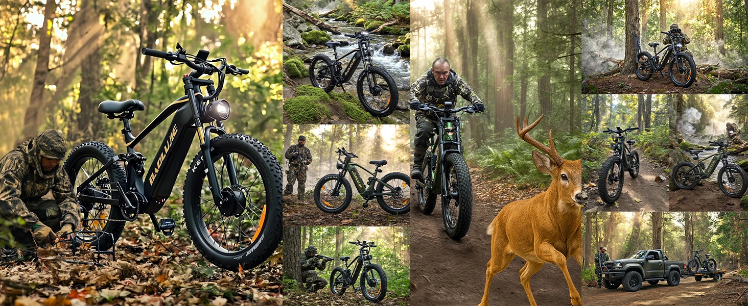 LONG RANGE BATTERY: Electric hunting bike built with a 52V 23Ah lithium battery; offers about 60–70 km on pure electric mode and 120–140 km with pedal assist; charging time about 7–8 hours