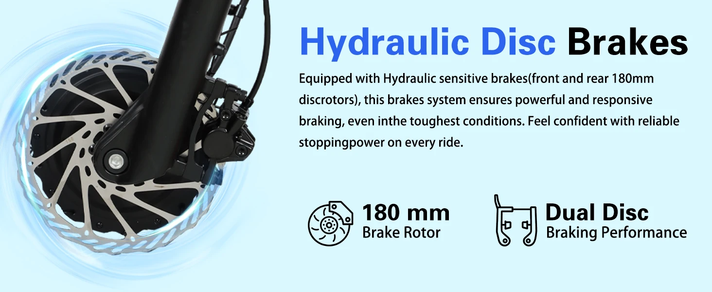 RELIABLE BRAKE PERFORMANCE: Electric hunting bike hydraulic disc brakes deliver stable stopping power; enhances rider safety during fast riding; works effectively on wet or uneven terrain