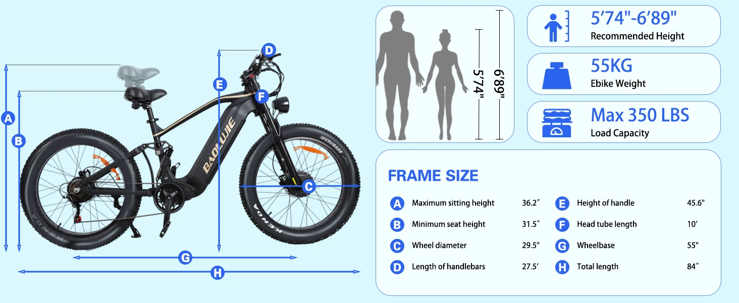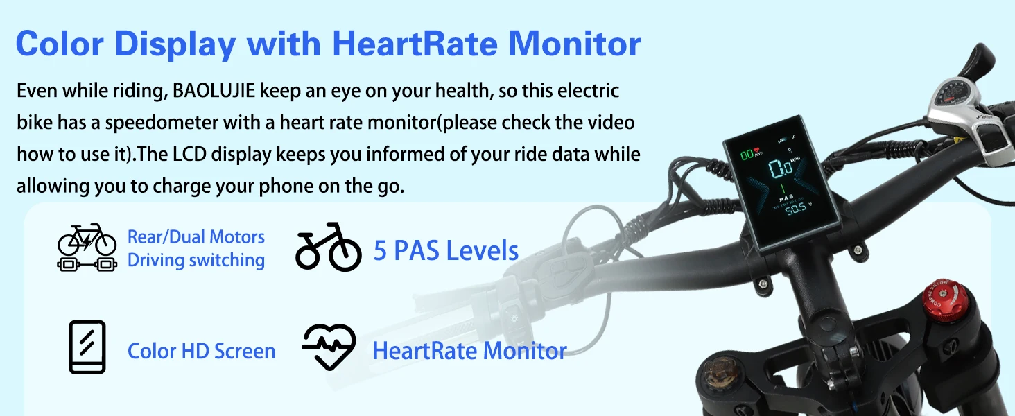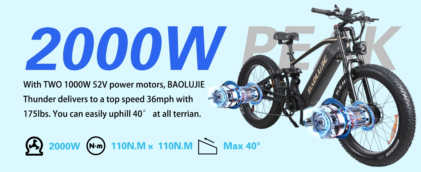 1200W Peak Brushless Motor: BAOLUJIE Dual motor ebike is powered by a robust 1200W high-speed brushless motor, boasting a top speed of 35MPH and maximum torque of 75N.m. Its impressive power and performance allow you to conquer steep inclines and long-distance adventures with ease. Whether you're commuting to work, enjoying a workout or exploring new routes, this electric bike for adults offers you a smooth and enjoyable experience.
