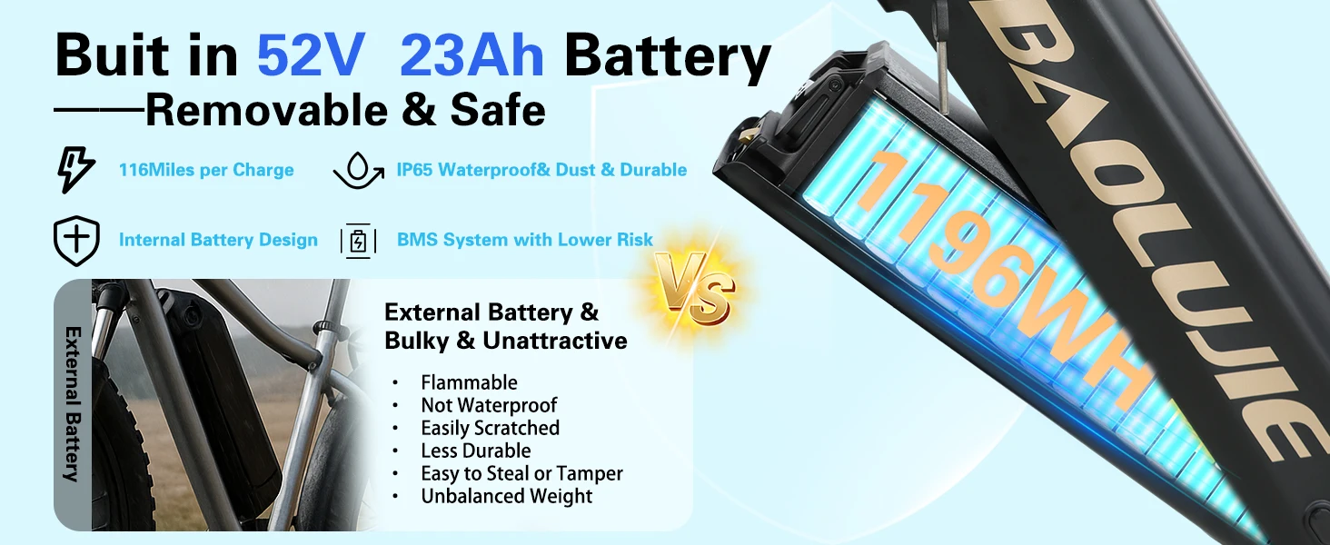 【Long Range 52V 32Ah Removable Dual Battery】2025 GERPSI 2603's 48V 44Ah: external removable 32Ah 𝐓𝐨𝐩 𝐀+ 𝐂𝐞𝐥𝐥 battery on the backseat, total 1664Wh. Providing an impressive range: 90-120KM (vary depend on mode, load, terrain & speed. For a long range: set PAS mode 1, single motor mode, pedal assist-no throttle). The waterproof removable battery has a protected switch/lock, allow remove out for charging, no worries about theft or rain.