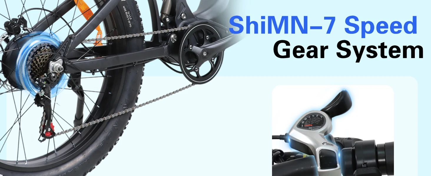 【ShiMN 7-Speed System】This professional ebike with ShiMN 7-speed gear shifter allows you to change the gears for adapting to different terrains, enhancing both riding comfort and efficiency. This all-terrain e-bike that can be used for off-road snow sand road etc.