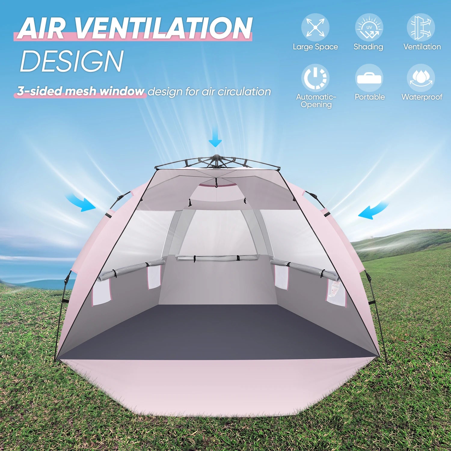 - ☀️360° Ventilation Beach Tent: Equipped with 3 large mesh windows, the portable sun shelter ensures excellent airflow and ventilation from every angle.