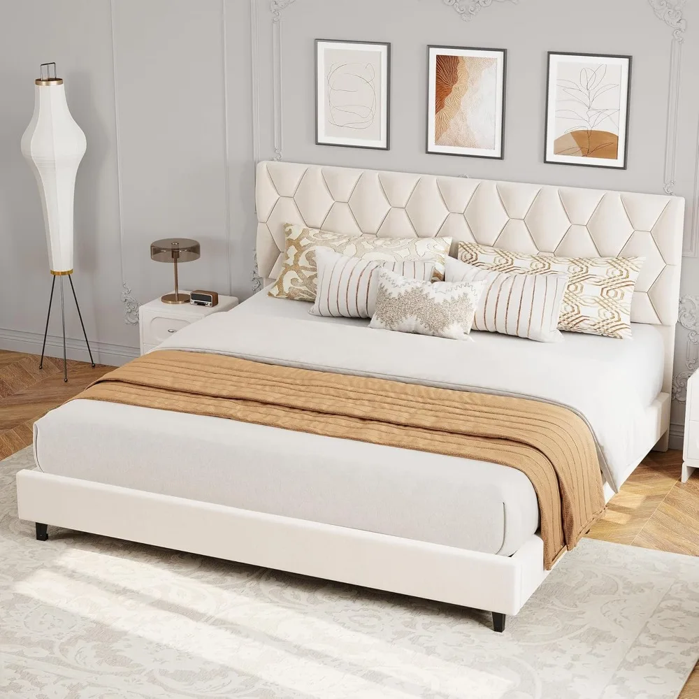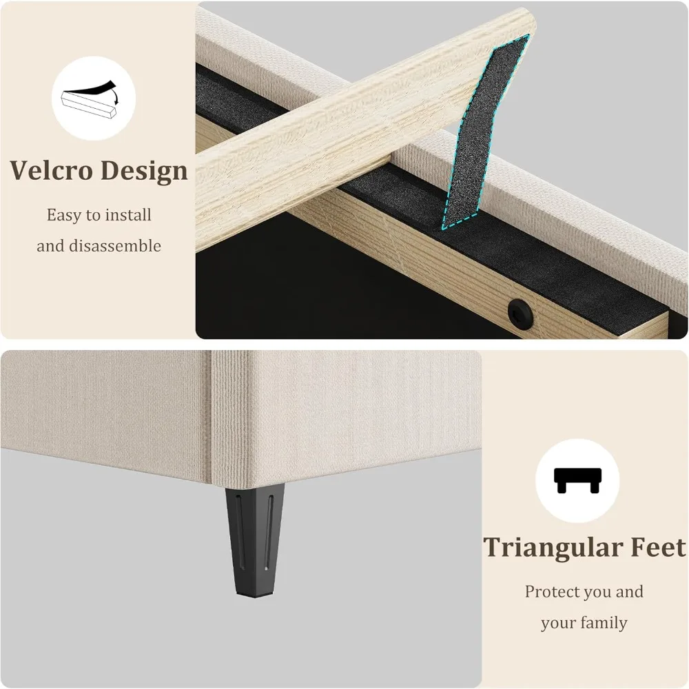 Beige King-Size Upholstered Headboard Bed Frame, Sturdy Wood Platform Base with Adjustable Headrest
