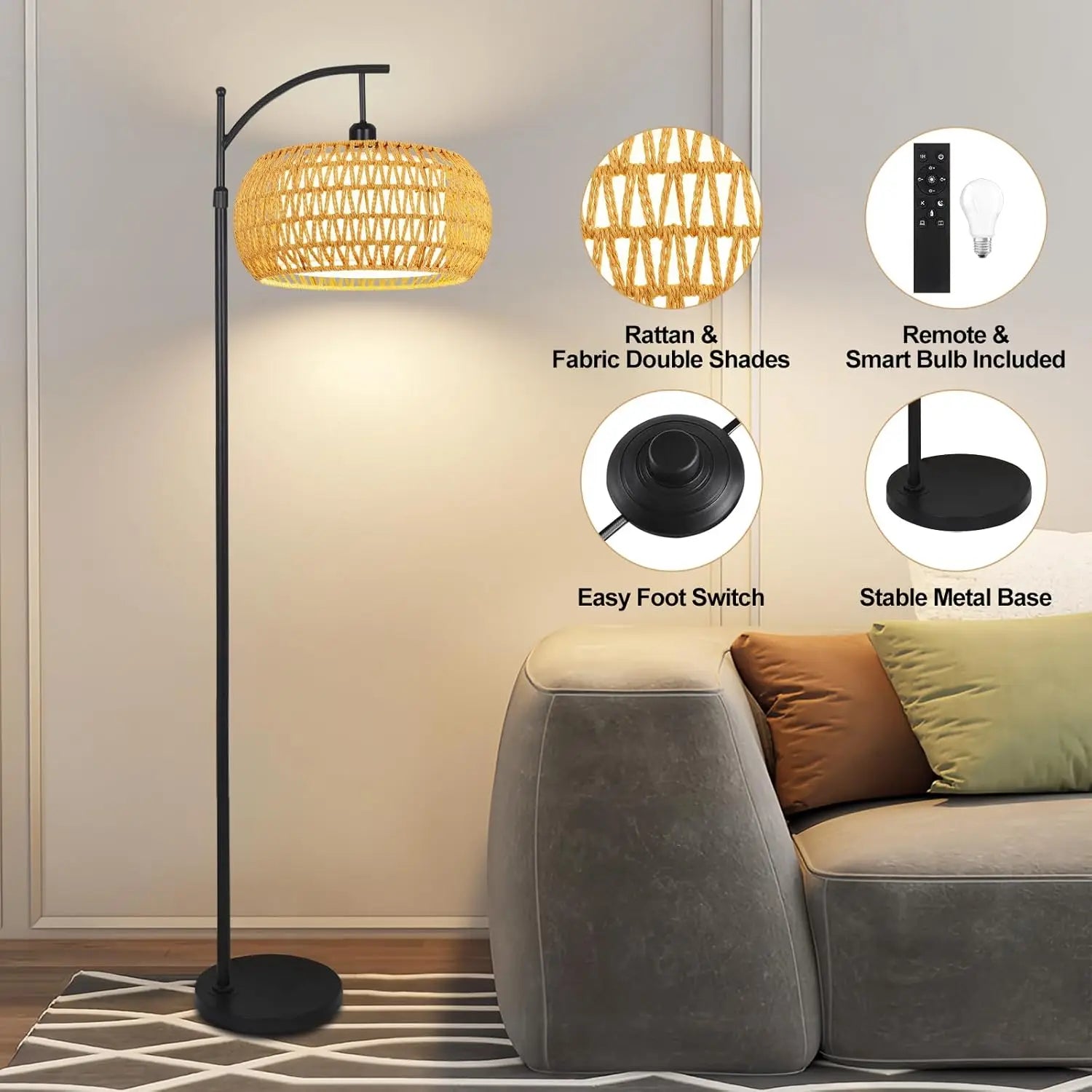 【Dual Control Remote or Footswitch】Boho floor lamp adopts a combination remote control and foot switch, assuring convenience for daily life. You can easily turn it on/off, adjust brightness, change colors or set timing modes by buttons, or connect this standing lamp to “Smart Home Light” APP, and control this rattan floor lamp with your phone (Max remote distance: 65ft/20m.