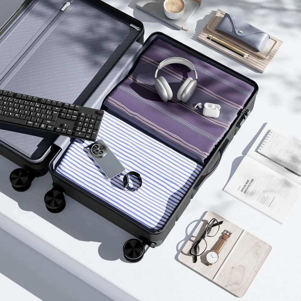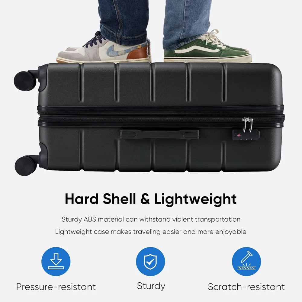 Sure, here's the description without any brand names, warranty information, chemical substances, or special symbols: - Smooth & Effortless Mobility: Equipped with 360° spinner wheels that glide smoothly and silently across all surfaces. The ergonomic telescopic handle ensures easy maneuverability, making this luggage a must-have for hassle-free travel. - Spacious & Organized Storage: Designed with dual compartments, including an expandable section for extra packing space. The left side features a zippered divider with a mesh pocket for small essentials, while the right side includes an X-strap to keep clothes secure and wrinkle-free. - Durable & Scratch-Resistant: Made from high-quality hard shell, this suitcase is impact-resistant, lightweight, and built to withstand travel wear and tear. The reinforced telescopic handle is sturdy and resistant to bending, ensuring long-lasting durability. - TSA-Approved Lock & Stylish Design: Features a TSA-certified combination lock for enhanced security and worry-free inspections. The sleek textured surface with horizontal stripes adds a modern, stylish touch while minimizing scratches. - Lightweight & Travel-Friendly: Meets most airline luggage size regulations. The lightweight build, top and side carry handles, and 3-level adjustable telescopic handle provide added convenience, making packing and transport effortless.