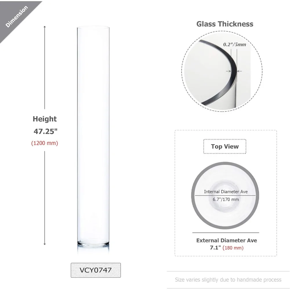 This product includes a set of two clear glass pieces, each carefully packed in a case. The vase filler and additional accessories are not included with the purchase. The glass pieces have a diameter of 7 inches (180 mm) and a height of 25.6 inches (650 mm), with a glass thickness of approximately 0.2 inches. Due to the handmade nature of the product, slight variations in thickness may occur. These durable glass items may have air bubbles and minor imperfections as a result of the handcrafting process. They can be used for a variety of purposes, such as holding plants (flowers), candles, decorative items, or lights, and can also serve as storage, an aquarium, or a centerpiece.