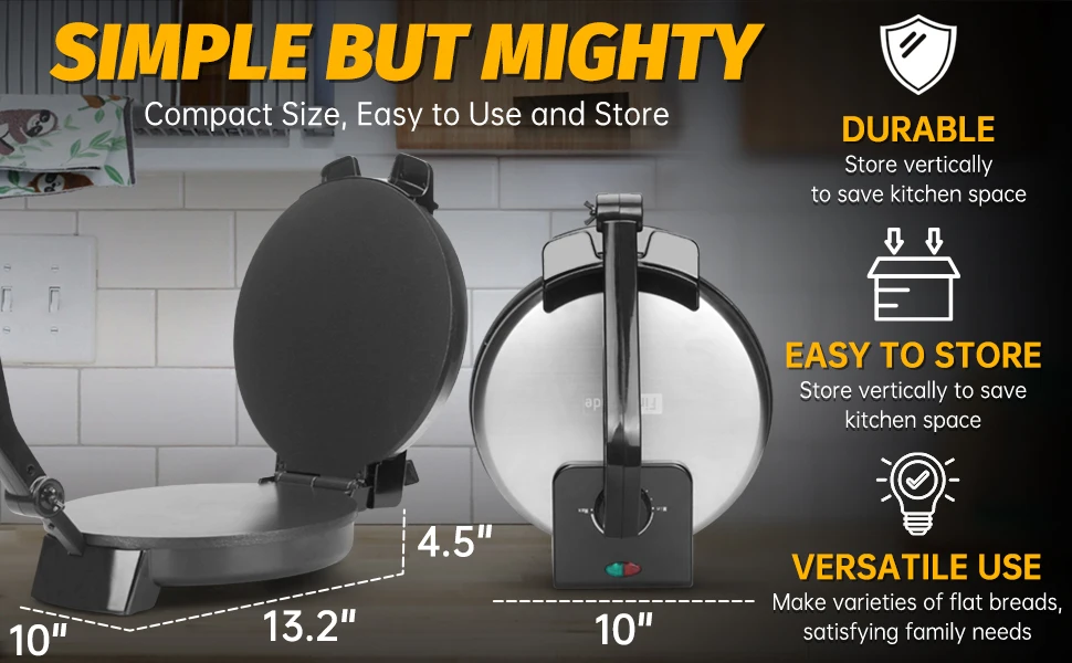 Compact 10'' Roti Maker Machine, Electric Tortilla Press with Detachable Handle, Chapati Maker Machine, Burrito Maker, Prensa Pa