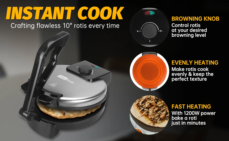 2. [TEMPERATURE PRECISION]: The Roti Maker is equipped with an advanced temperature control system, empowering you to customize the heat setting to your roti preferences. Whether you crave a soft, airy roti or a crispy, golden-brown delight, adjusting the temperature to perfection is at your fingertips, ensuring consistent texture and flavor in every batch.