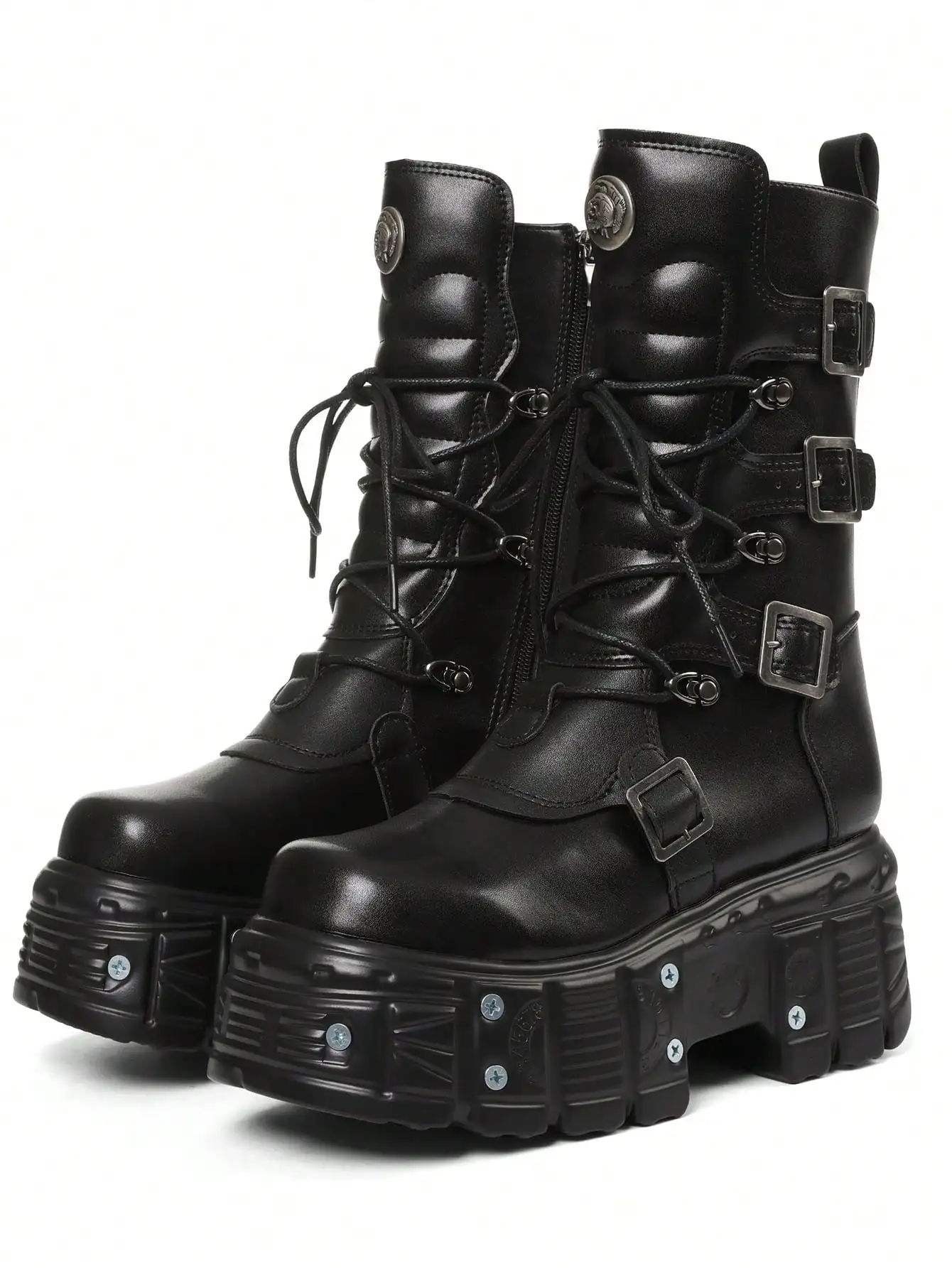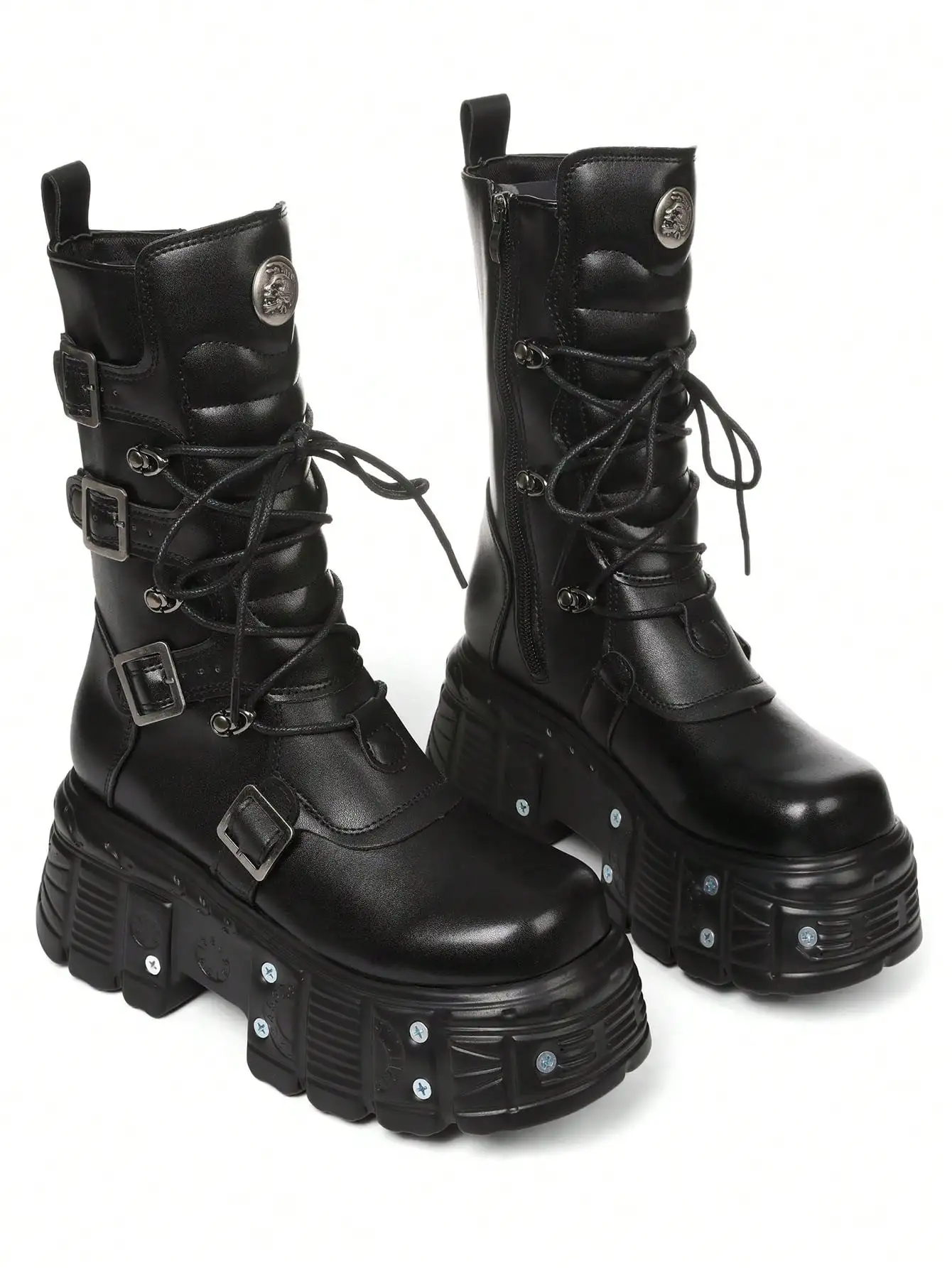 Cool Fashion Women Combat Boots Chunky Heels Thick Bottom Studs Zip Buckle Platform Punk Gothic Luxury Women Street Shoes