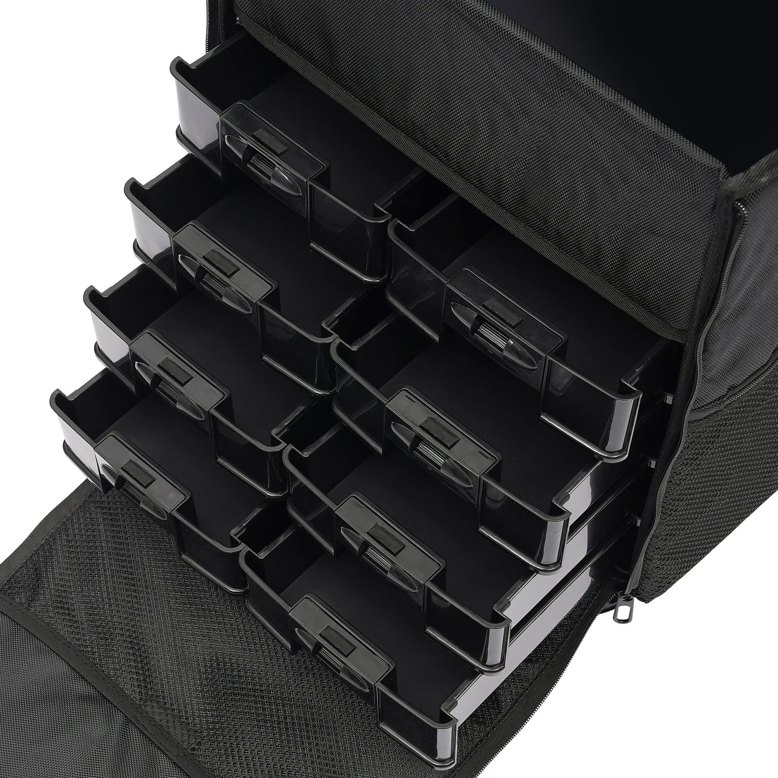 Do you want luxury and durability at work or at home? You can find it here! The rolling makeup case is made of high-quality Oxford fabric, waterproof, durable, and easy to clean. 8 removable drawers meet your multi-category storage needs. Mesh elasticated pockets with clear soft PE lid make items visible and not easy to slip off. The left and right sides have large-capacity mesh pockets with metal zip closures that allow for small items. Universal wheel design provides you with high portability.