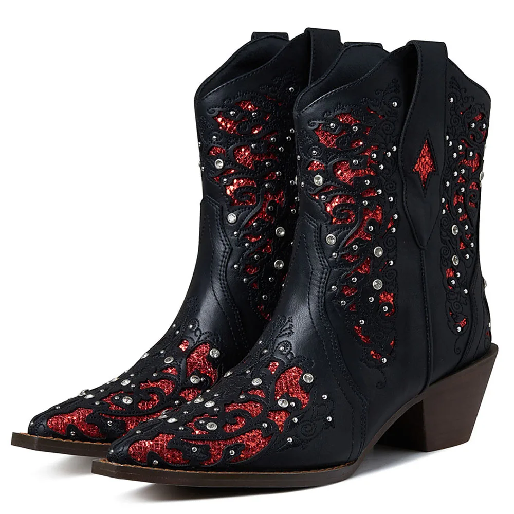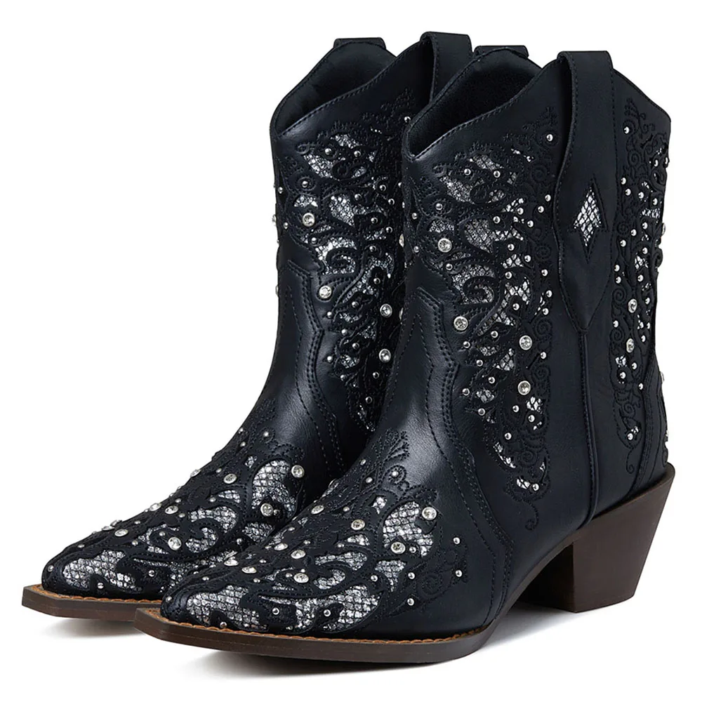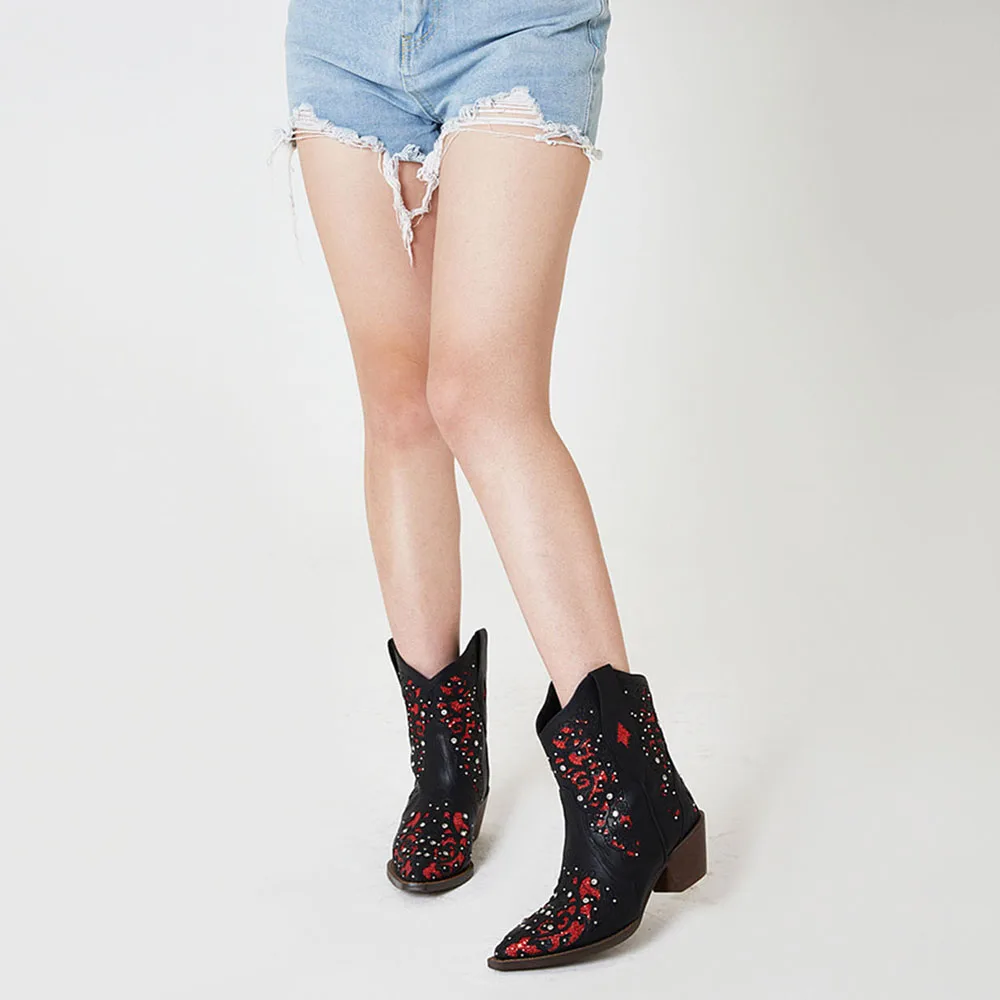 DoraTasia Embroidered Pointed Toe Women Ankle Boots Chunky High Heel Slip-On Crystals Western Boot For Woman Fashion Retro Shoes
