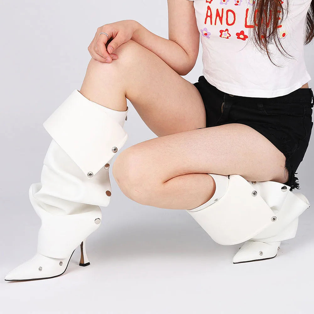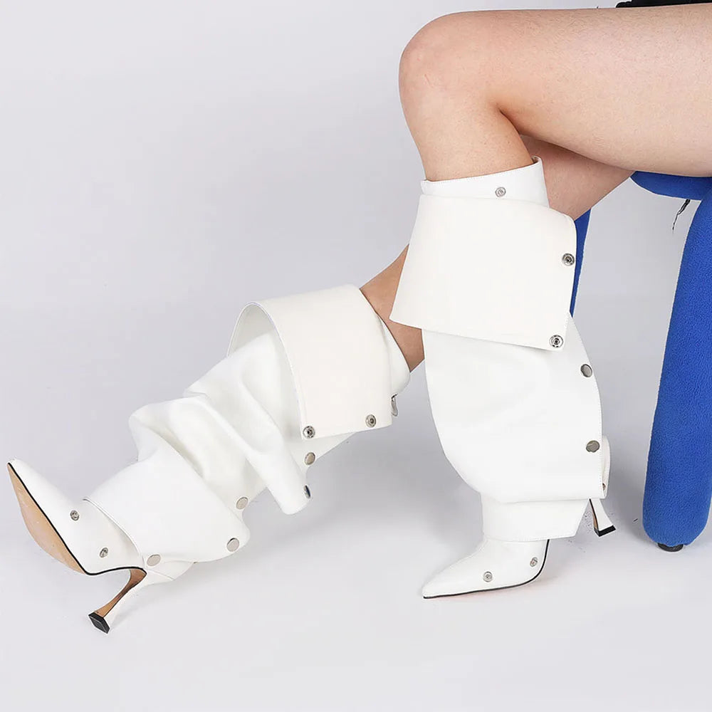 DoraTasia Fashion Fold Over Knee High Boots Pleated Pointed Toe Stiletto High Heeled Women Boots Zipper Rivet Shoes For Woman