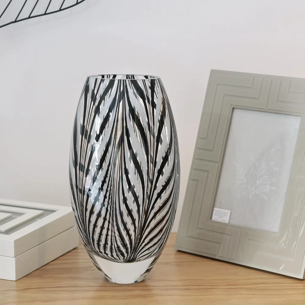 Doro Murano Style Glass Vase Black and White Feather Pattern Hand Blown Art Glass for Flower, Room Decoration and Centerpiece